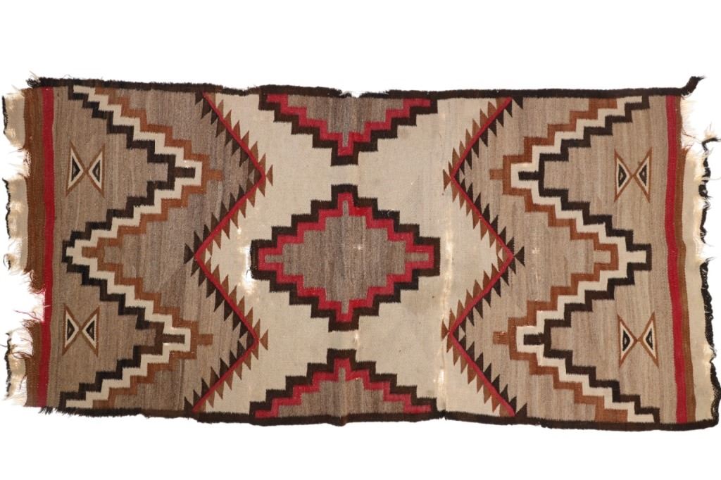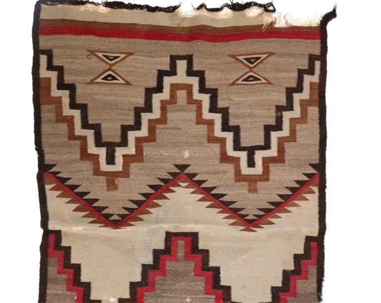 This is a fabulous early 1900’s J.B. Moore Navajo Old Crystal wool rug from a private-Montana collection. The rug exhibits some natural hand-spun wool with natural and aniline dyes with colors of red, browns, white / creams, tans, grey. J.B. Moore was a native of Sheridan, Wyoming and bought an interest in the trading post at Washington Pass, N.M., also known as Cottonwood Pass, in 1896. The Crystal Trading Post was established in 1896 by Moore on the Navajo Reservation in far western New Mexico, high up in the Chuska Mountains. In 1897, JB Moore purchased the entire interest in the trading post and renamed it “Crystal” after a “pure and sparkling mountain spring that ran by the post.” The remoteness and limited winter business led Moore to issue mail order catalogs in 1903 and 1911, selling Navajo rugs to people in the eastern U.S. Moore had a strong interest in Navajo weaving and was "instrumental in promoting a bordered rug style, more suited to the tastes of Anglo buyers." Early Navajo Crystal rugs from the 1903 catalog were often made from natural hand-spun wool yarn and featured traditional Navajo weaving patterns common in the last quarter of the nineteenth century. He abruptly left the Navajo Reservation in the autumn of 1911. This rug shows a nice weave with lazy lines throughout and nice variation of color and fine early Crystal detailing. The rug shows some loss to the weave, a few small worn spots, and edge damage, but overall still a stunning rug with impressive colors and well matched on both sides. Measures 71-inches long by 34-inches wide.