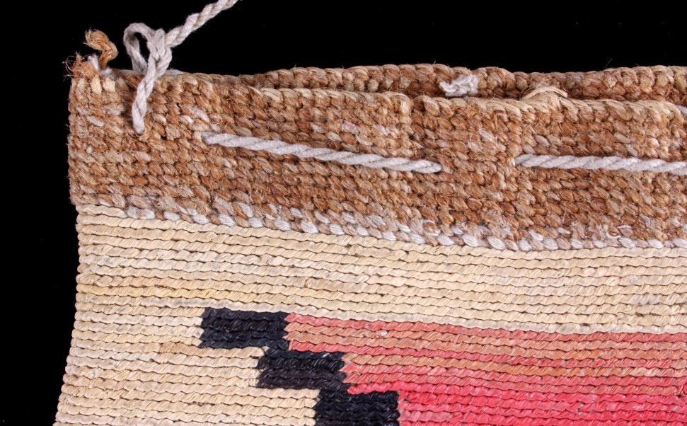 This is a Nez Perce corn husk bag from the early 1900's. The bag shows a traditional tight weave using the corn husk fibers and dyed with natural organic and mineral dyes. The bag shows a unique and intricate design on both sides with darker band near the top and bottom. The Nez Perce corn husk bag is in good overall condition with minor unraveling at the top as shown. The bag measures 13.75" W and 16.5" L.