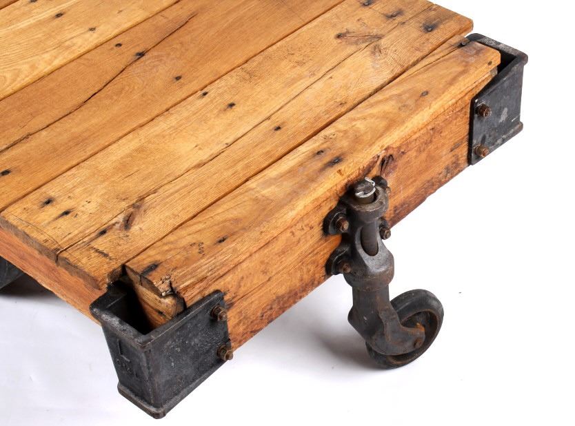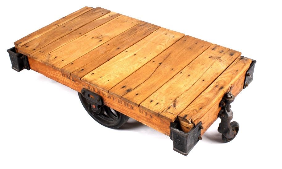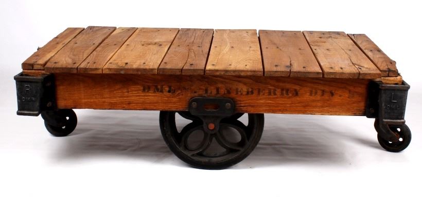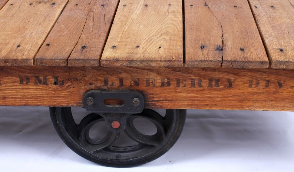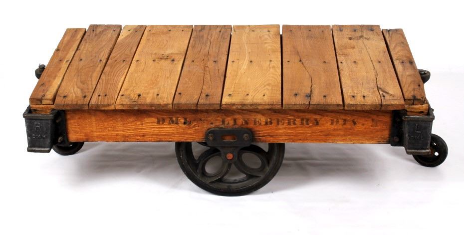 Included in this lot we have a early 1900's original DML inc. Lineberry factory cart. The Lineberry factory cart was created at the start of the industrial revolution as an easy way for factory workers to move and transport items quickly. It was a staple in the industry for many years and is regarded as the best in the industry. These factory carts, also known as railroad carts, are highly sought after for use as coffee tables, garden carts, side tables, or display tables. Its unique and rugged look makes it perfect for Montana ranch homes, hunting cabins, or barn lofts. The cart is constructed out of solid oak boards with cast iron wheels and fittings and has had some minor restoration. The art is marked "DML INC. LINEBERRY DIV." on the side and the cast iron plated are marked "L - C 14 L" or "R - C 14 R". The cart is in very good condition, with some scuffs and cracks on the top of the cart due to age. The cart measures 53" long by 28" wide by 15 1/2" tall.