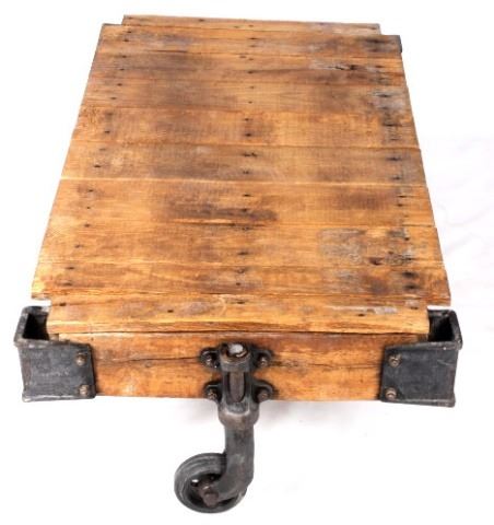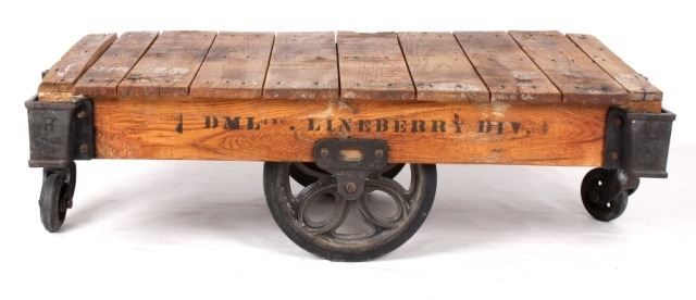 Featured in this lot we have a original early 1900's DML inc. Lineberry factory cart. The Lineberry factory cart was created at the start of the industrial revolution as an easy way for factory workers to move and transport items quickly. It was a staple in the industry for many years and is regarded as the best in the industry. These factory carts, also known as railroad carts, are highly sought after for use as coffee tables, garden carts, side tables, or display tables. Its unique and ruggid look makes it perfect for Montana ranch homes, hunting cabins, or barn lofts. The cart is constructed out of solid oak boards with cast iron wheels and fittings and has had some minor restoration. The art is marked "DML INC. LINEBERRY DIV." on the side and the cast iron plated are marked "L - C 14 L" or "R - C 14 R". The cart is in very good condition, with some scuffs and wear on the top of the cart due to age. The cart measures 53" long by 28" wide by 15 1/2" tall.