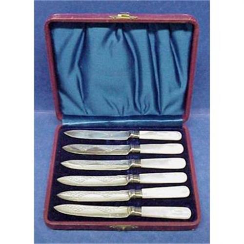 Gorgeous set, made by Henry Birks and Sons,The finest goldsmiths in Canada at that time,Edwardian era, These 6 knives come in original burgundy color leather bound box,(which shows the age and use as per picture) lined with royal blue satin, displaying set of exquisite fruit knives, each knive is signed by the maker,and the band that separates blade from the wonderful pearl handle is hallmarked in English sterling: Crown,Lion and small s, Love the fine engraving on each blade, Excellent condition, no damage to pearl handles, they are nice, strong and solid heavy.US Buyer please pay 8.00 for shipping plus insurance.6.5" long - Thank You for looking!