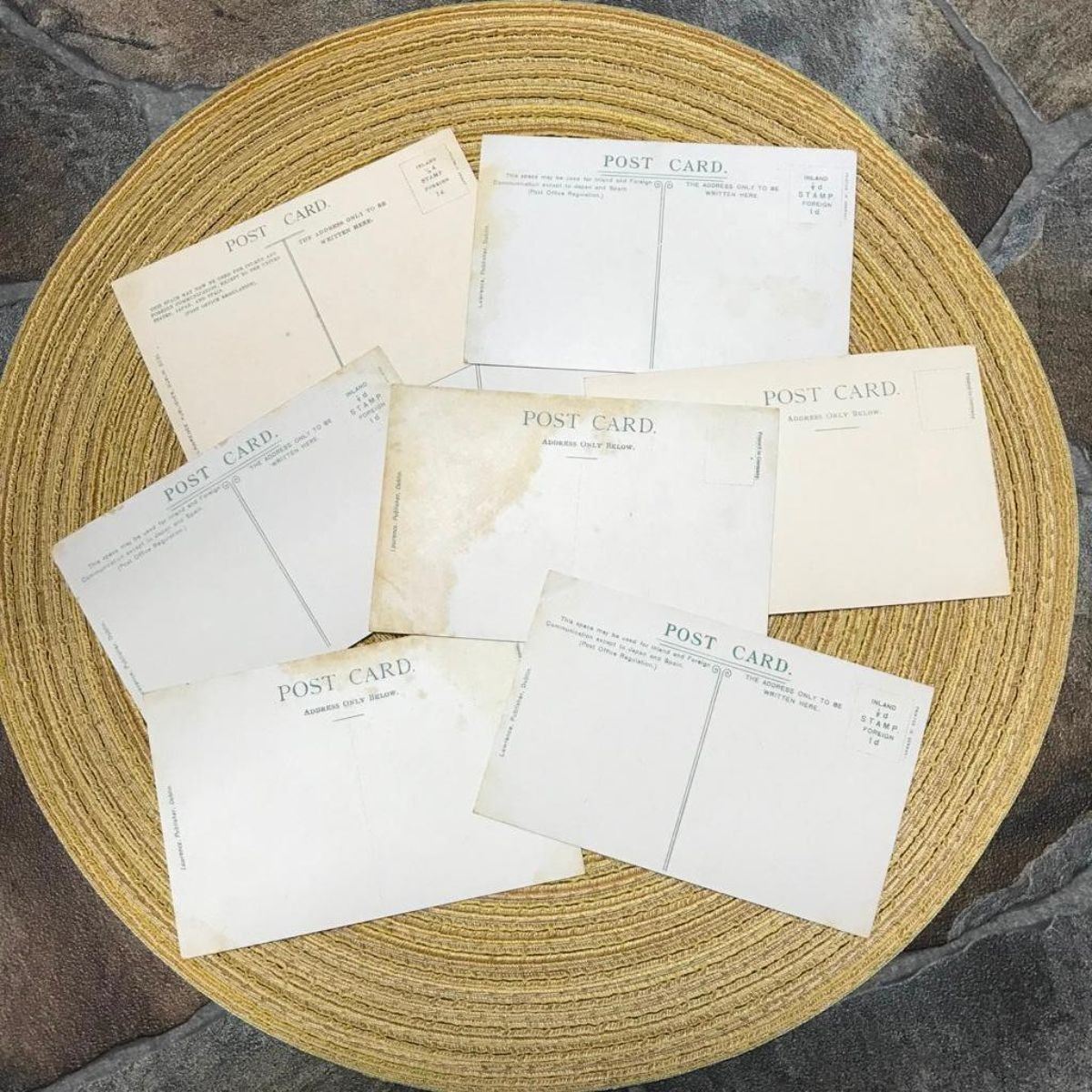 Group of 8 early 1900's period colored travel postcards, scenes of Killarney Ireland to include : Ross Castle, 2- Gap of Dunloe, Old Weir Bridge, Eagle's Nest Mountain, Torc Mountain from Dinis, Cap Cottage with thatched roof & Muckross Abbey. Â 3 1/2" X 5 1/2" each. Published in Dublin, in vintage but unused condition.