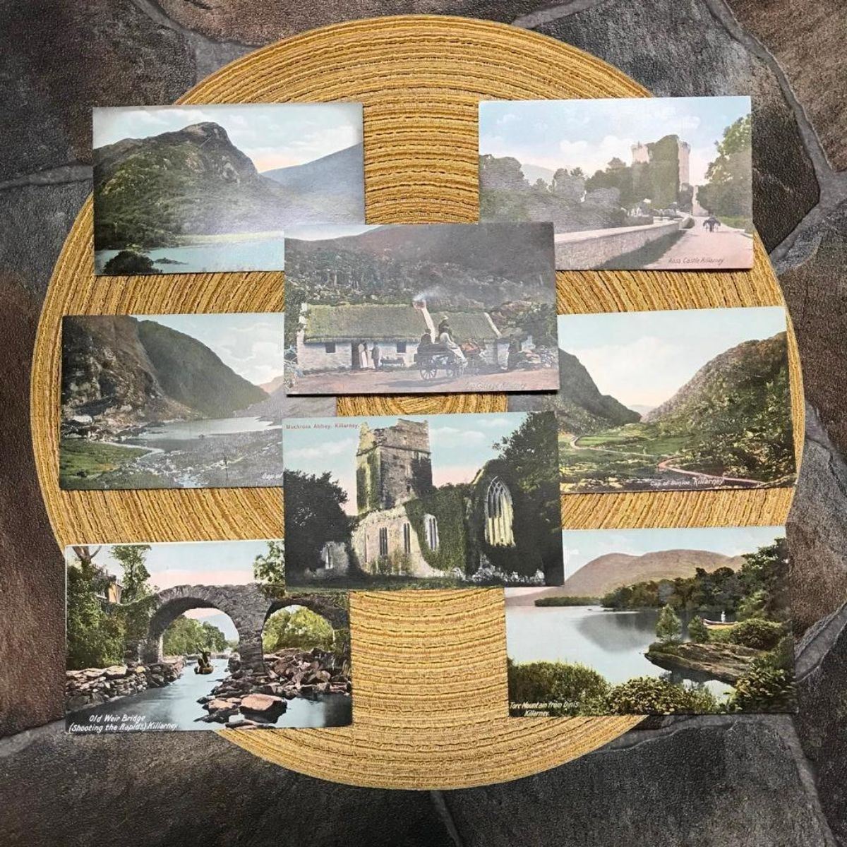 Group of 8 early 1900's period colored travel postcards, scenes of Killarney Ireland to include : Ross Castle, 2- Gap of Dunloe, Old Weir Bridge, Eagle's Nest Mountain, Torc Mountain from Dinis, Cap Cottage with thatched roof & Muckross Abbey. Â 3 1/2" X 5 1/2" each. Published in Dublin, in vintage but unused condition.