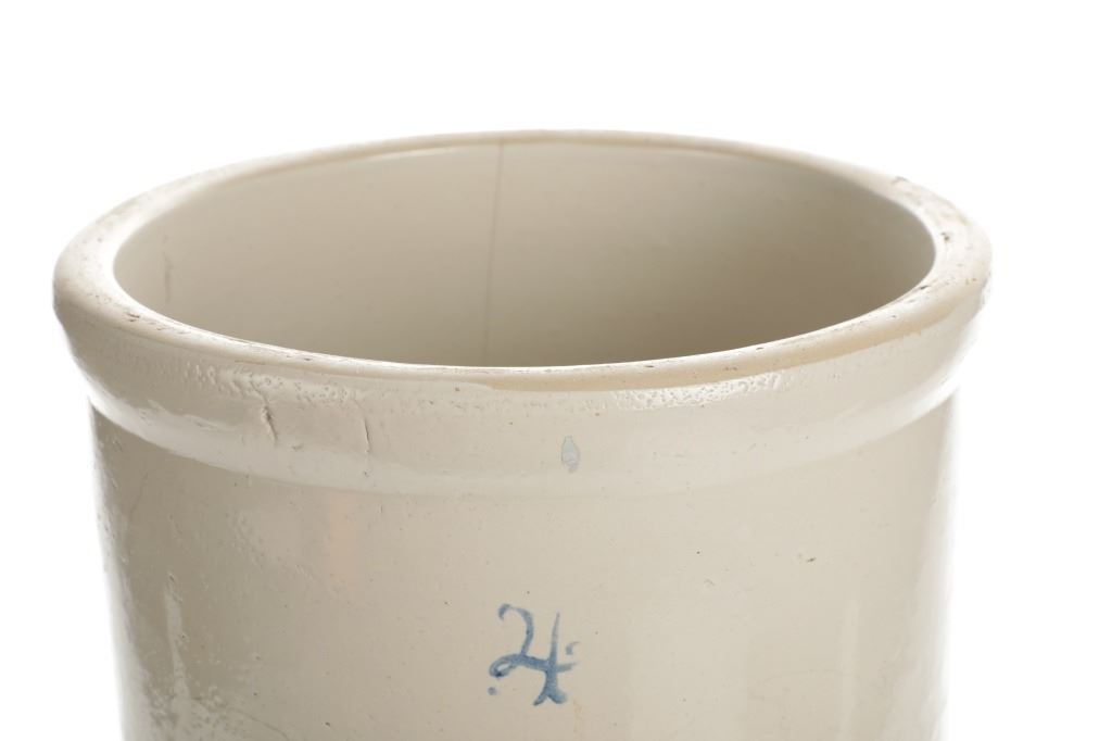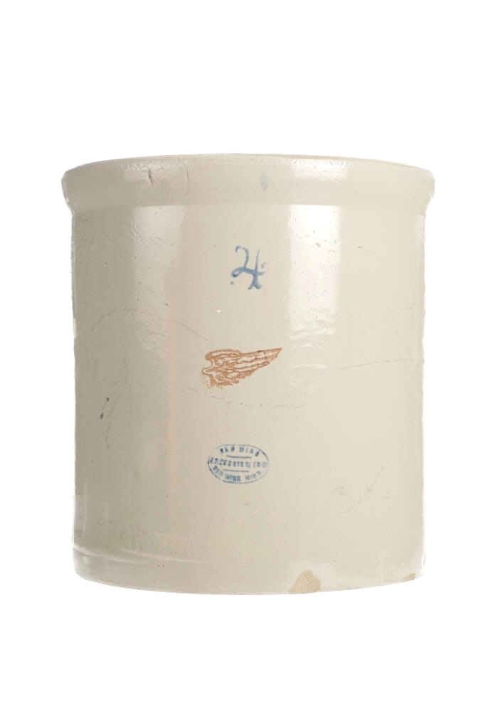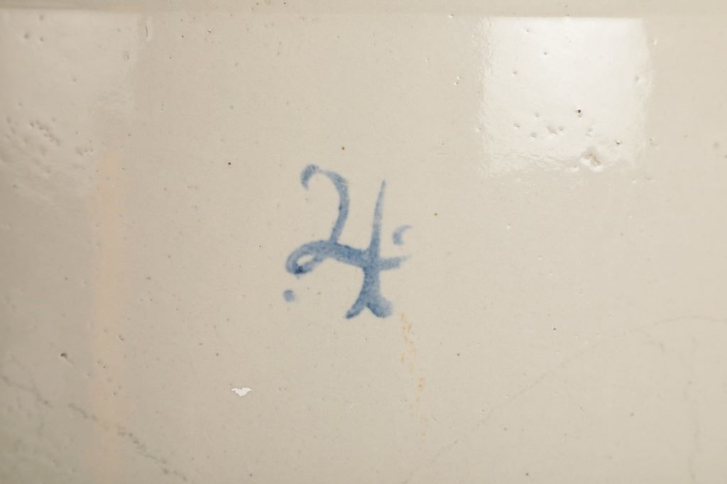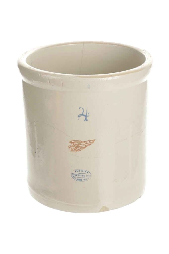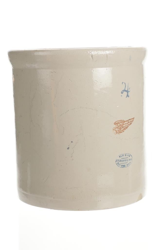 Featured in this lot is this four gallon Red Wing glazed crock originating from the early 1900's. The crockware shows a glazed outside with a Red wing marking underneath a '4' and shows the Red Wing hallmark underneath that Red Wing mark. The condition of this crock is good with a vertical hairline fracture on the side walling but otherwise shows good overall condition. The measurements of this crock are 12" x 11 1/2" x 11 1/2".