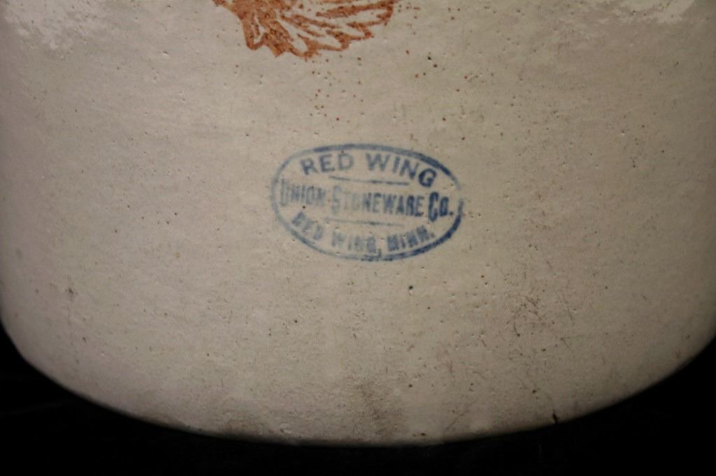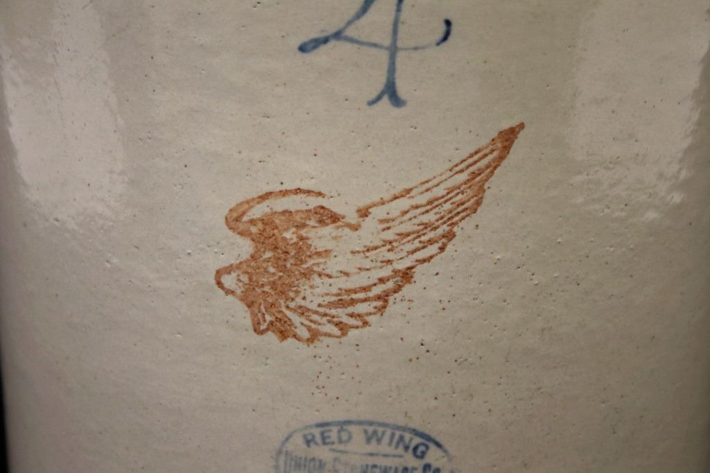 Featured in this lot is this four gallon Red Wing glazed crock originating from the early 1900's. The The crockware shows a glazed outside with a Red wing marking underneath a '4' and shows the Red Wing hallmark underneath that Red Wing mark that reads: Red Wing - Union Stoneware Co. - Red Wing, Minn. The condition of this Red Wing crock is good with no obvious signs of damage and shows good overall condition. The measurements of this Red Wing crock is 16 1/4" x 10" x 10".