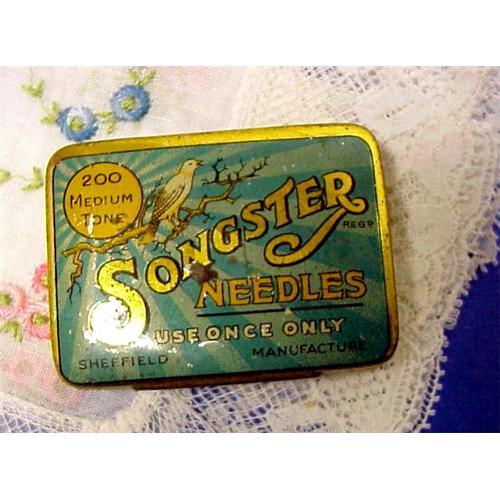 Gorgeous antique Brittish Made - Sheffield Gramophone Needle Box "SONGSTER" It contained 200 medium tone needles , still left few left in the box - Excellent condition for it's age, please take a look at our images - Measures 3/4" x over 1/2" - US Buyer to pay 6.00 for insured shipping - We accept Paypal, Visa, Master Card or Money Order - Thank You very much for looking!