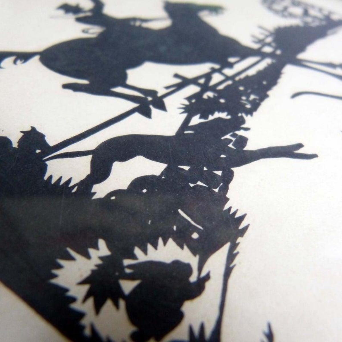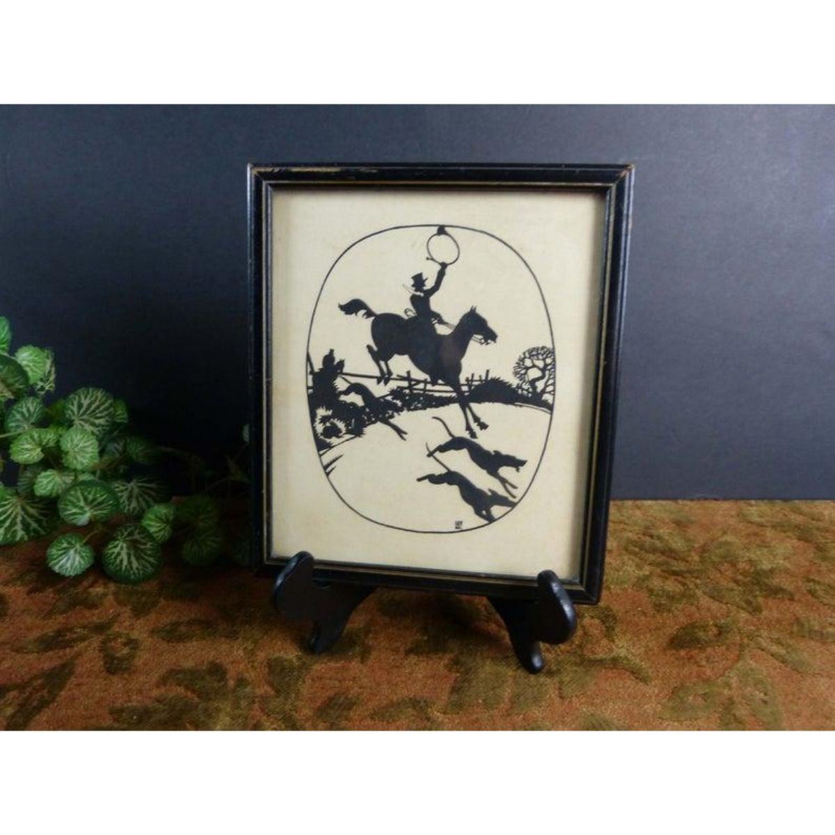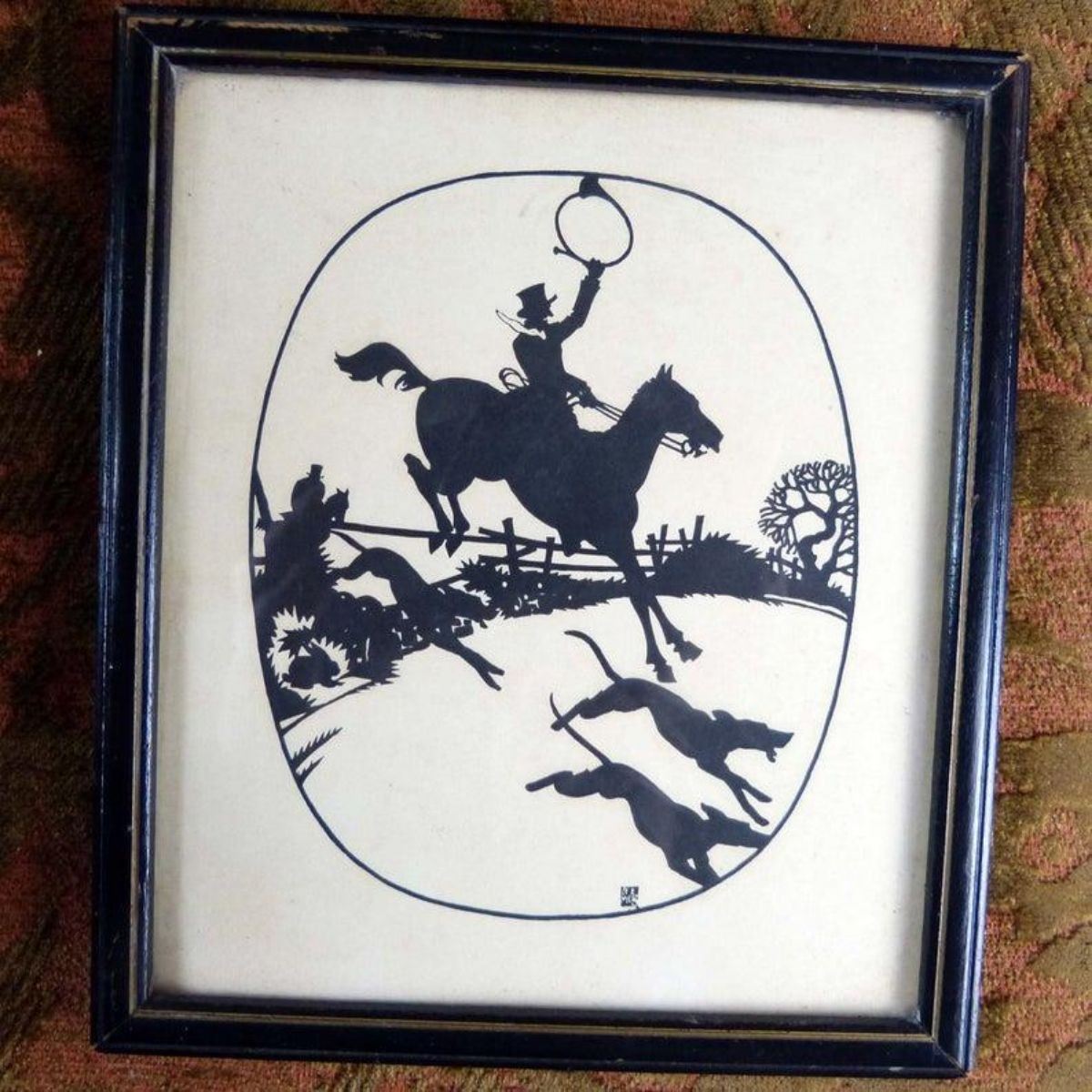 A framed fox hunt cut silhouette & mounted on cream parchment. The scene is in great detail with horses, dogs a fence row & trees with a humorous narrative. The hare they are hunting is hiding in the hedgerow they are jumping. Framed in the traditional black wood with gold liner. There is a tiny signature, Lee Mero, that has also been cut out & attached to the circle around the scene. On the back of the frame is a sticker for M.I. Lusky Jewelry Co. in Nashville, TN. that was burned to the ground in a fire in 1922, dating this silhouette sometime before 1922. Measures 7 1/2" x 6 1/2" framed.