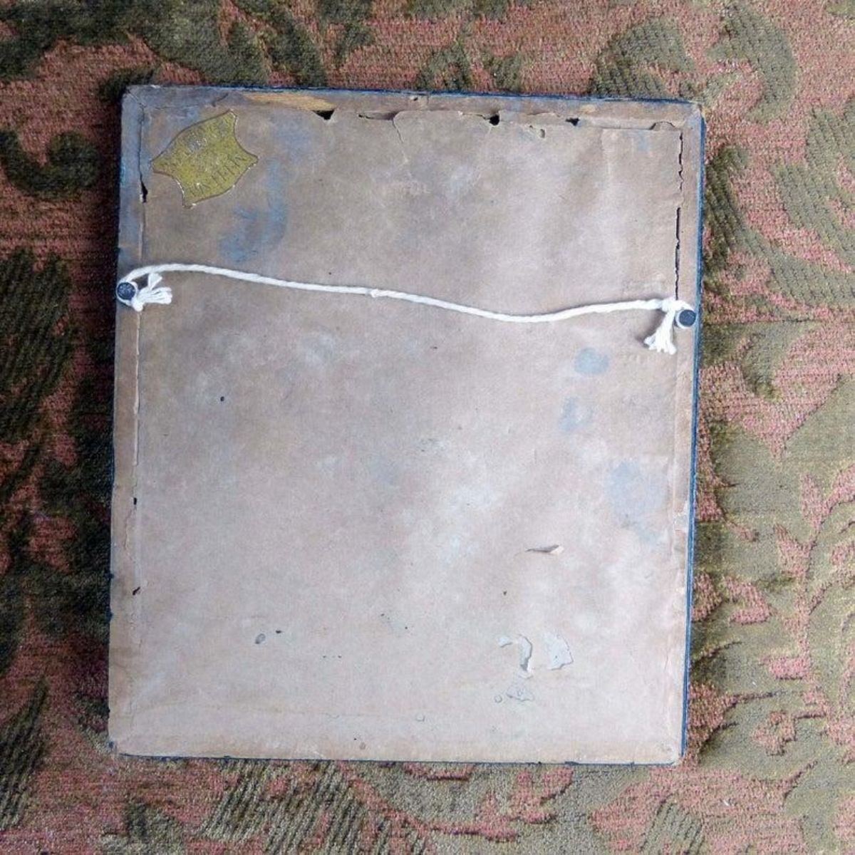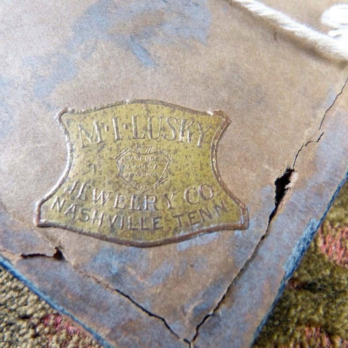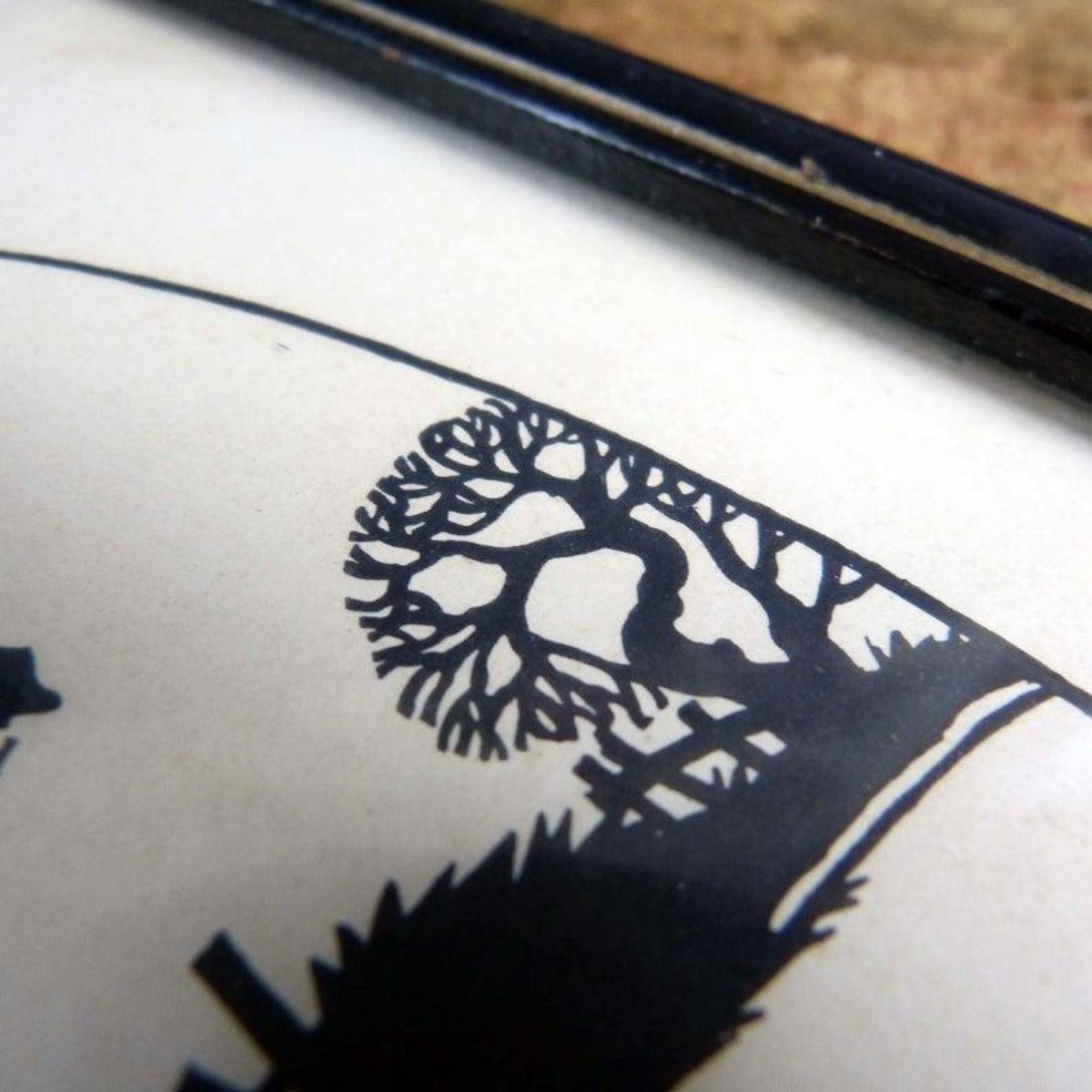 A framed fox hunt cut silhouette & mounted on cream parchment. The scene is in great detail with horses, dogs a fence row & trees with a humorous narrative. The hare they are hunting is hiding in the hedgerow they are jumping. Framed in the traditional black wood with gold liner. There is a tiny signature, Lee Mero, that has also been cut out & attached to the circle around the scene. On the back of the frame is a sticker for M.I. Lusky Jewelry Co. in Nashville, TN. that was burned to the ground in a fire in 1922, dating this silhouette sometime before 1922. Measures 7 1/2" x 6 1/2" framed.