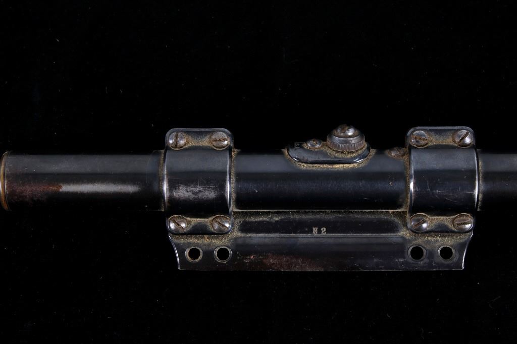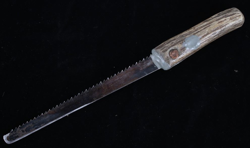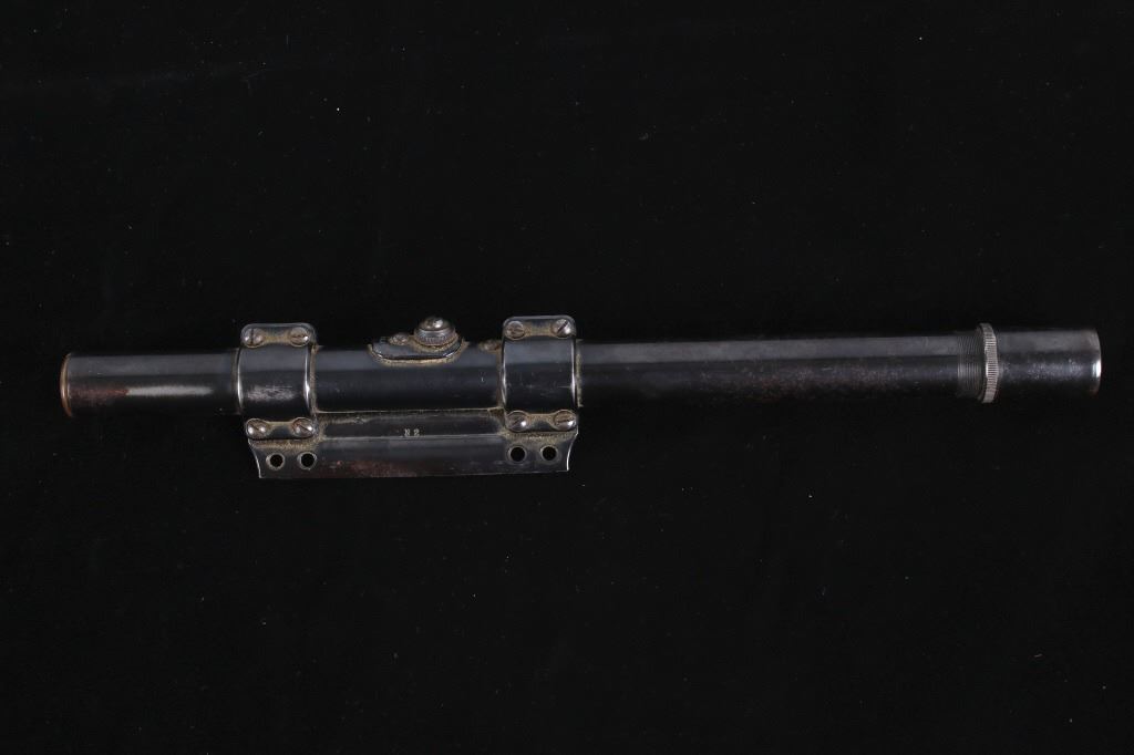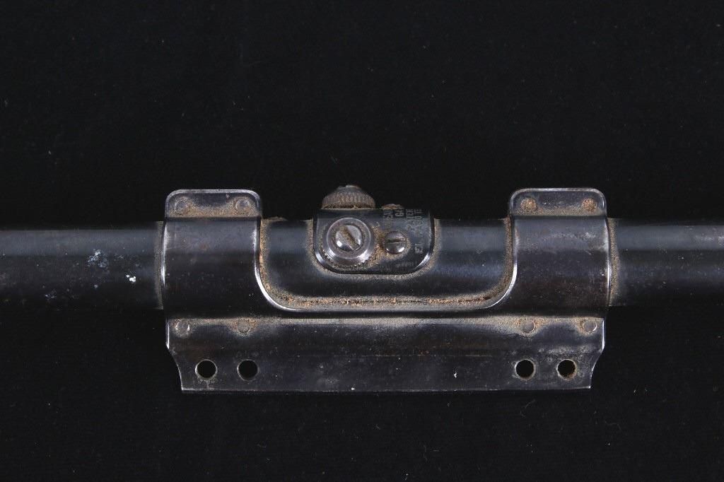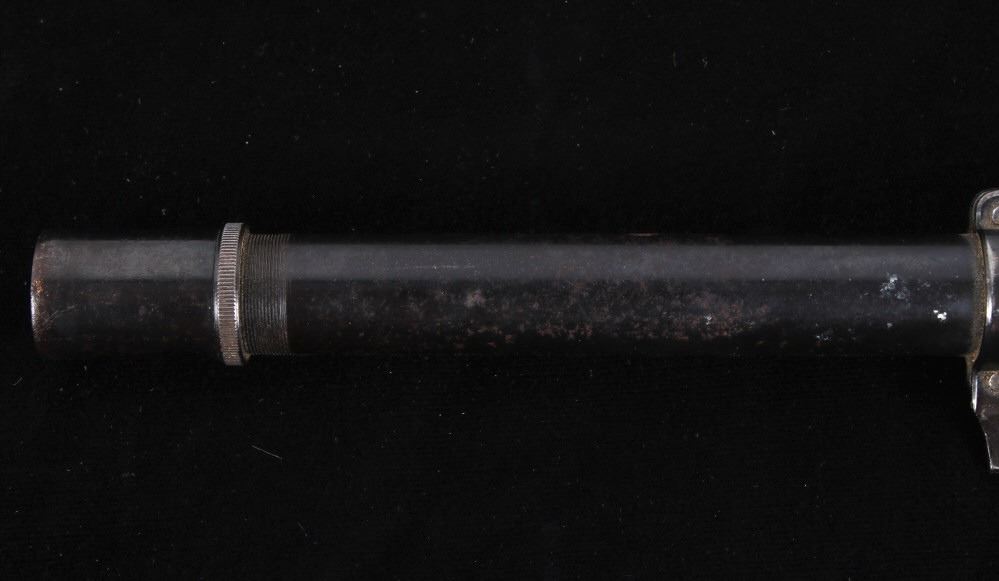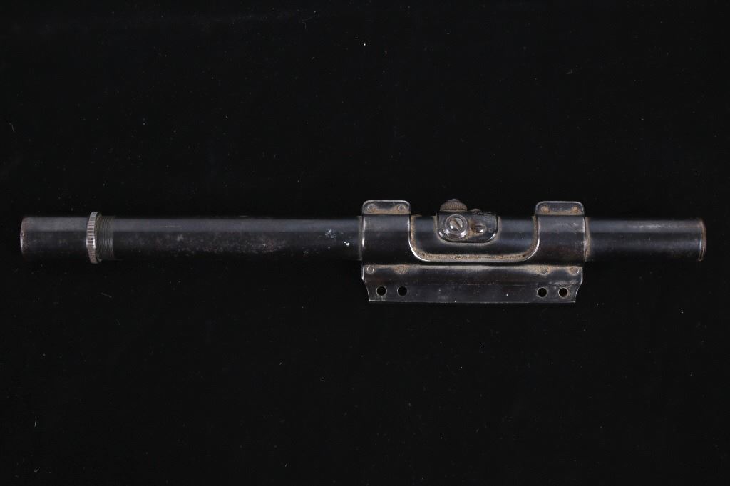Featured in this lot is this trapper telescopic sight and knife collection, circa early 1900's. There are two items in this collection. The first is a telescopic sight with what seems to be 4x magnification. The second item is a trapper saw blade with an older antler tine handle. The condition of these two items is fair, with the knife showing a contemporary epoxy fix to the handle and bottom of the blade and shows a hand-crafted knife sheath with brass tacks holding it together. The measurements of this sight system are 1 3/4" x 1 1/8" x 11 1/2" and the knife and sheath measures 12 1/4" and a blade length of 7".