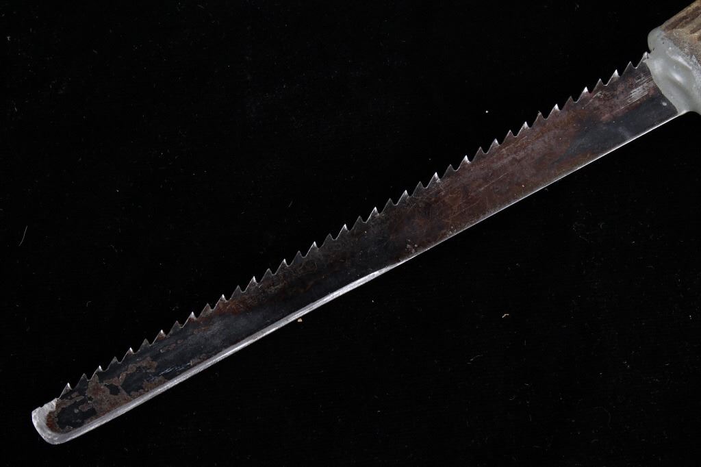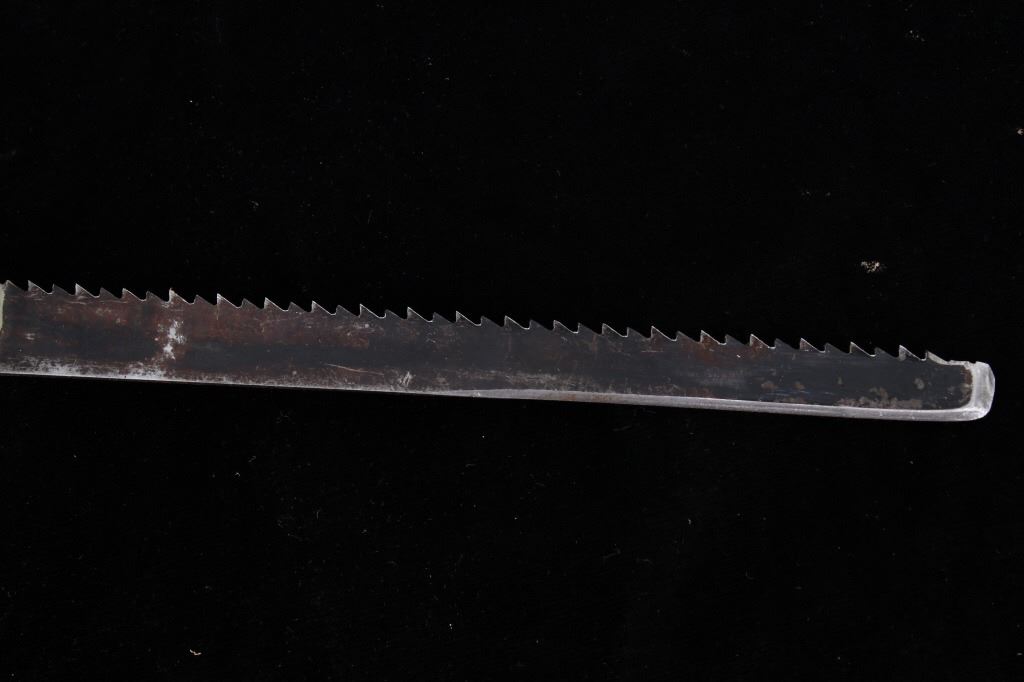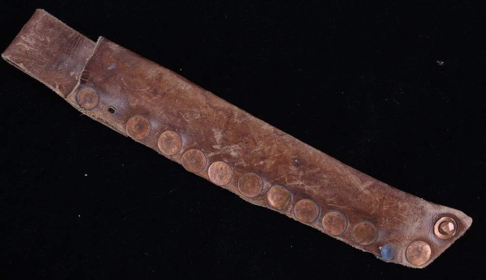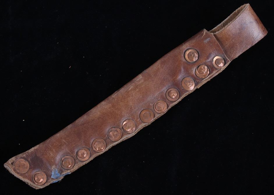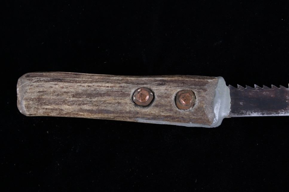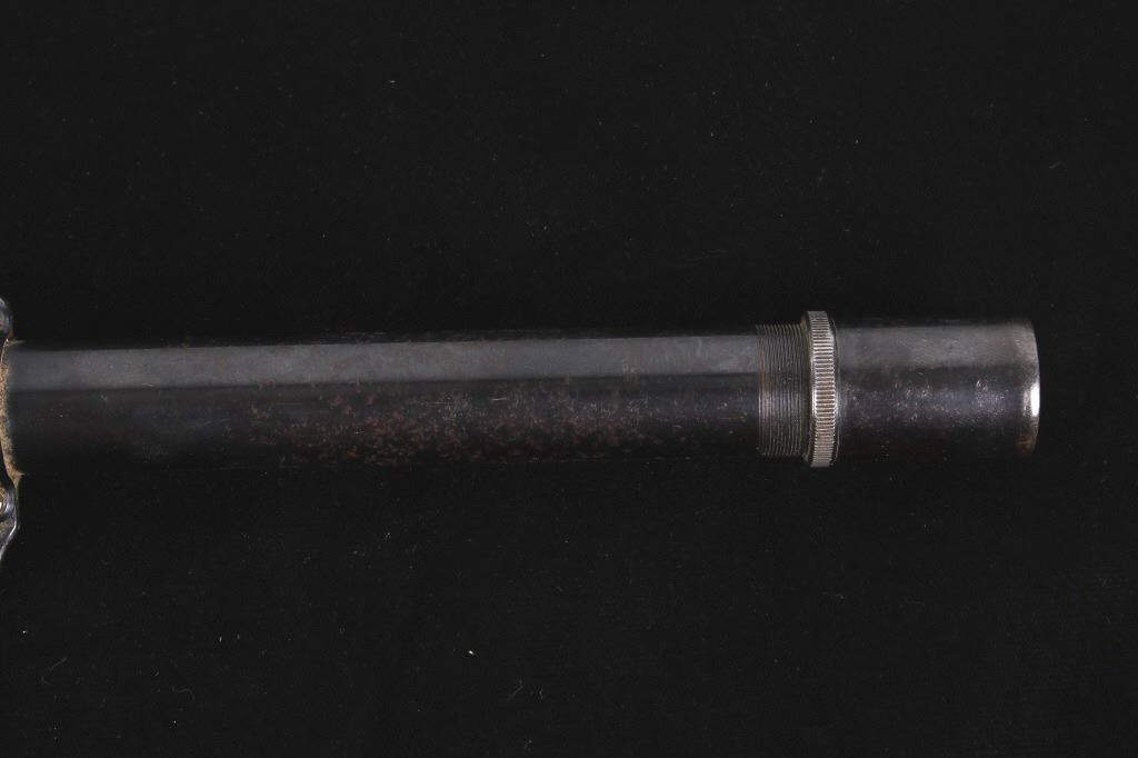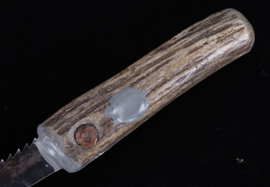 Featured in this lot is this trapper telescopic sight and knife collection, circa early 1900's. There are two items in this collection. The first is a telescopic sight with what seems to be 4x magnification. The second item is a trapper saw blade with an older antler tine handle. The condition of these two items is fair, with the knife showing a contemporary epoxy fix to the handle and bottom of the blade and shows a hand-crafted knife sheath with brass tacks holding it together. The measurements of this sight system are 1 3/4" x 1 1/8" x 11 1/2" and the knife and sheath measures 12 1/4" and a blade length of 7".