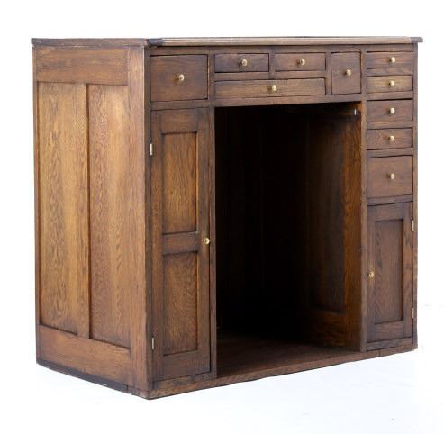 Offered for your bidding pleasure we have this Early Watchmaker's Desk. This desk originates from the early 1900's and was used by a horologist, more commonly known as a watchmaker. At this time in the early 1900's, Watchmakers were master craftsmen who built watches, including each and every piece, by hand. This desk shows ten drawers used to hold hardware for the Watchmaker. The desk also features two cabinet doors for added storage. This piece of history shows excellent quality and craftsmanship. The desk measures 41" wide, 23" deep and 38 1/2" in height.