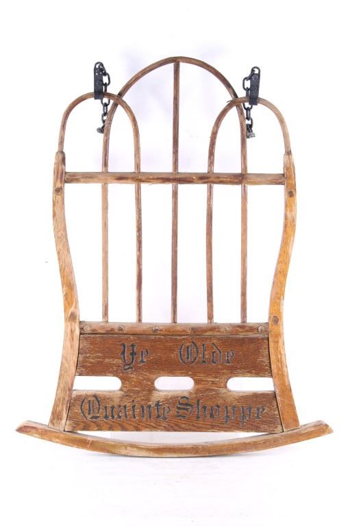 For your consideration is this early 1900's Ye Olde Quainte Shoppe trade sign. This is a wonderful piece of history as trade signs were extremely important in the marketing of ones wares, so have such a well preserved sign as this really brings that history to life. This is a trade sign from the early 1900's the store and destination of store is unknown but is the shop name is spelled in Olde English denoting early lineage of age for this sign. This sign is in good condition and shows oak sign with black lettering with chains that hang the sign from a post. The measurements of this trade sign are 34 1/2" x 28".