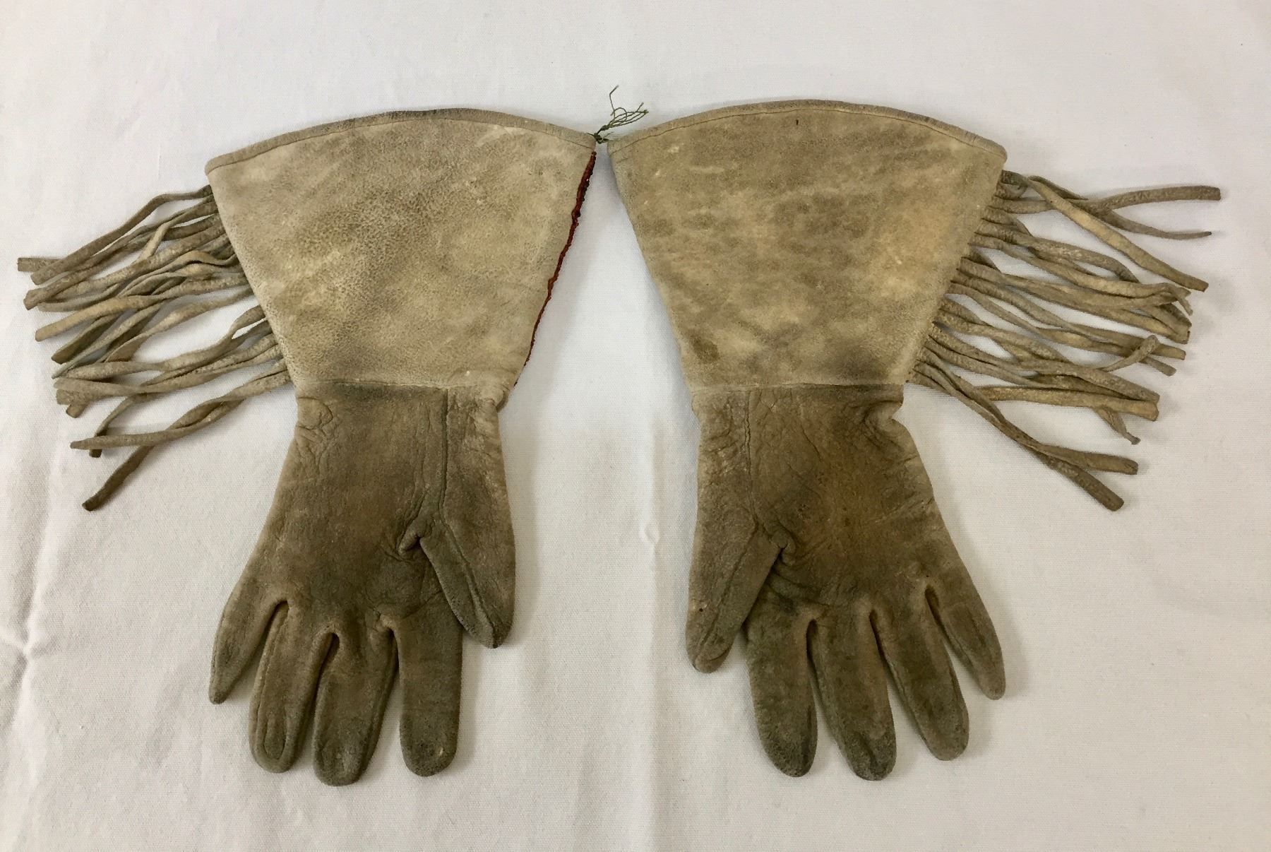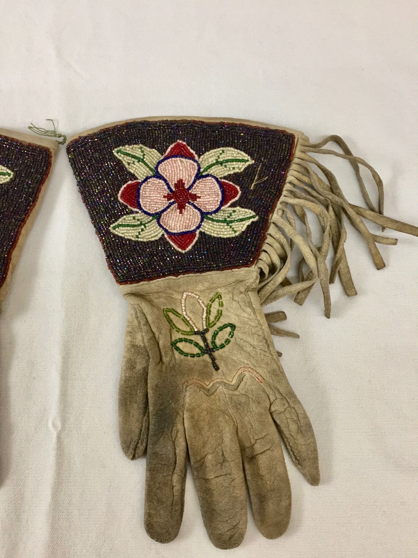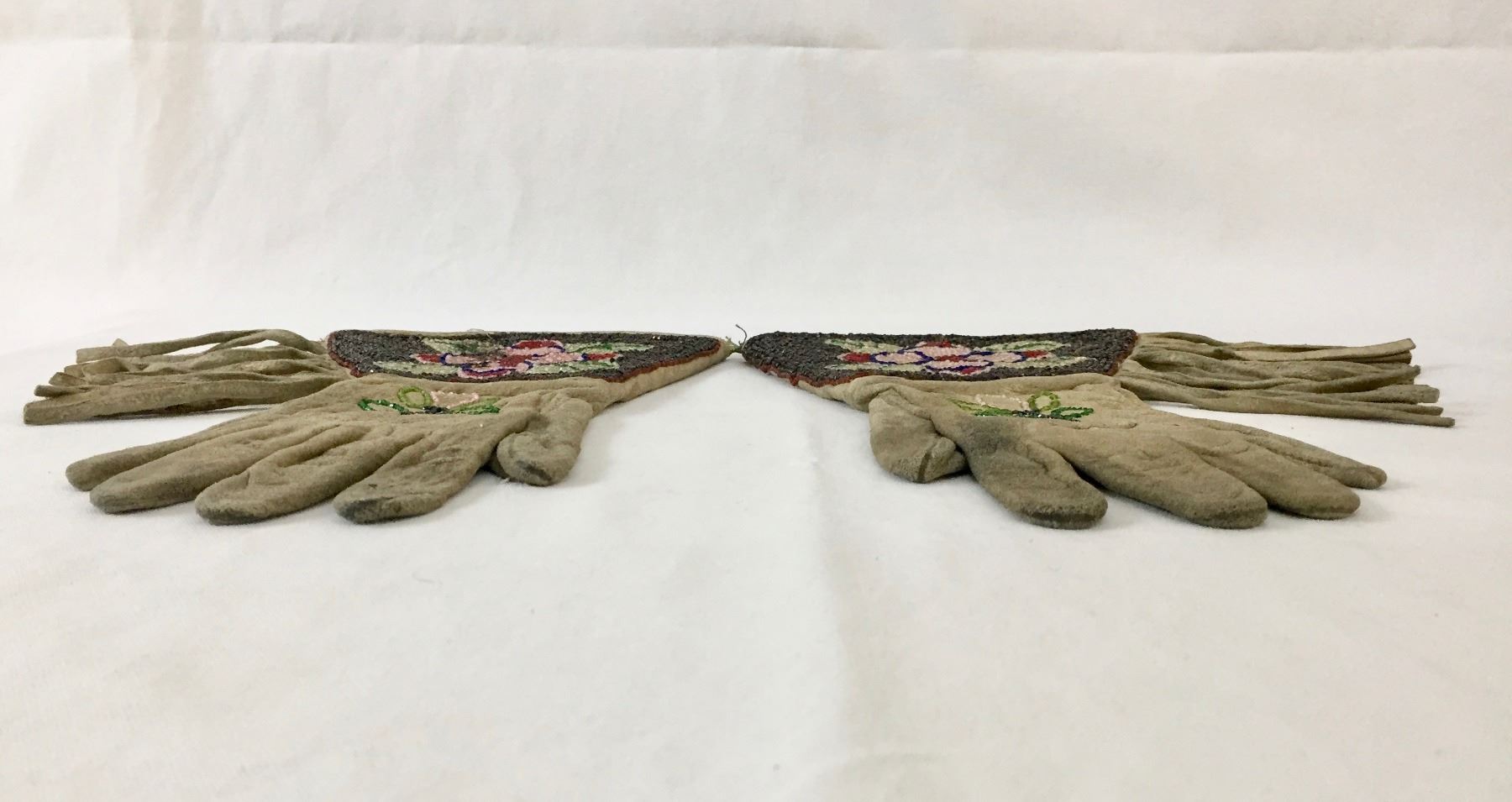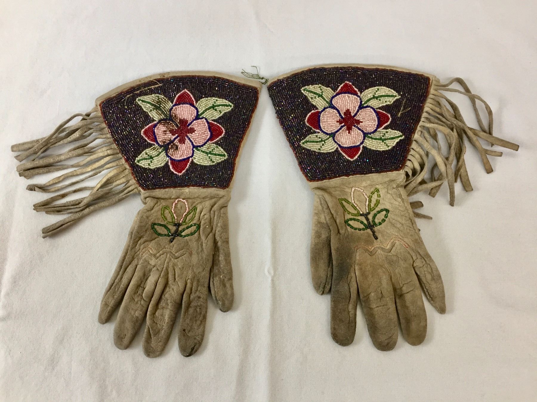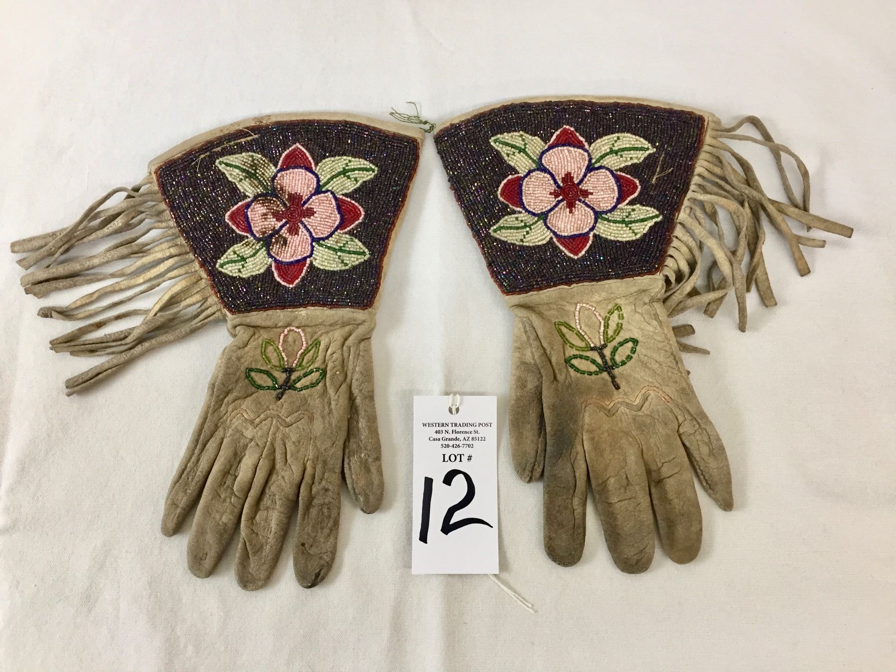 Description: Offered in this lot is a nice pair of beaded gauntlets. These gauntlets feature leather fringe and are adorned with beadwork in a flower pattern. Maker: Unknown, but are Plateau or upper Plains in style. Approx. Age: Circa early 1900s. Size: Measures 7”w x 12”l. Condition: Good for its age, normal wear expected. Please look closely at the pictures - they are an important part of our description. Shipping: There will be a $5 handling / packaging fee for shipping this lot. The actual cost of postage will be added on top of that.