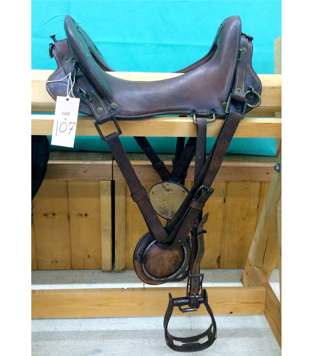 This early 1900s McClellan saddle is stamped “11" seat". Mostly original (except stirrups). In good condition for its age.