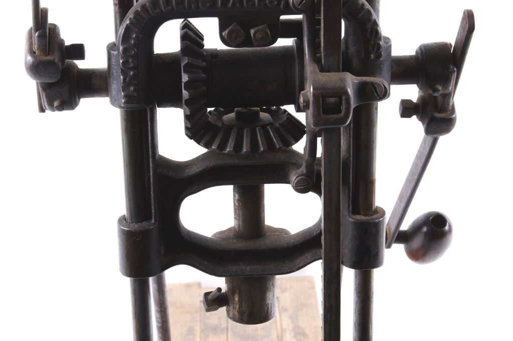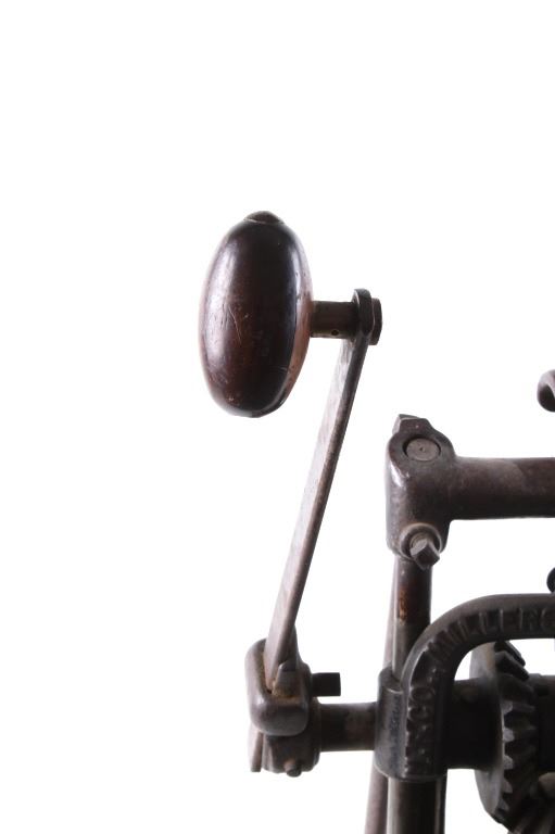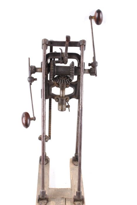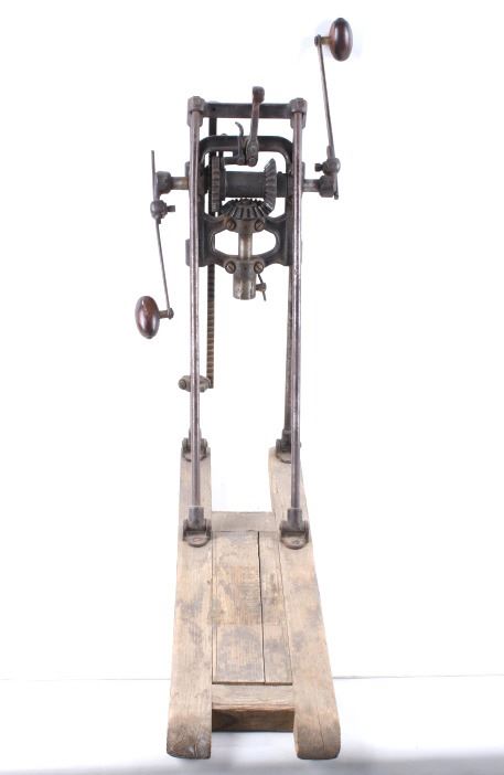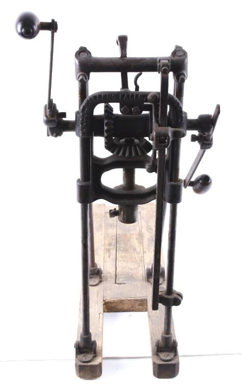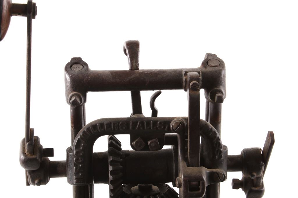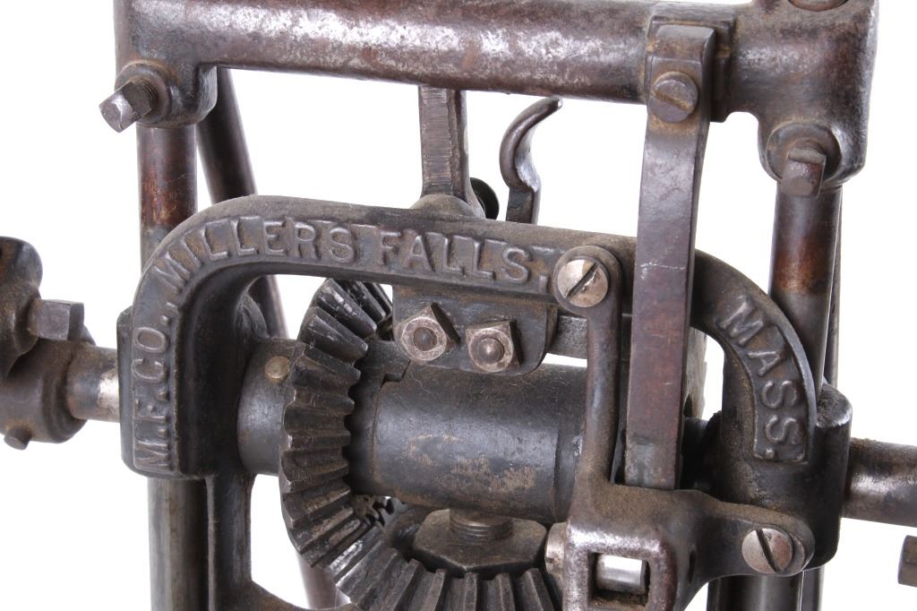 Included in this lot we have a Miller Falls hand crank boring machine originatin from the early 1900's. The machine was used to bore holes in large wooden beams for wood pegs to make mortise and tenon. The piece shows steel construction with a wooden base and crank handles. The machine shows a large gear system with a drill bit attachment point. The face of the piece is marked "M. F. Co., Miller Falls, Mass". The machine shows good condition overall with some wear due to age and use. The bore machine measures 25 1/2" tall by 27 1/2" long and 12 1/2" wide.