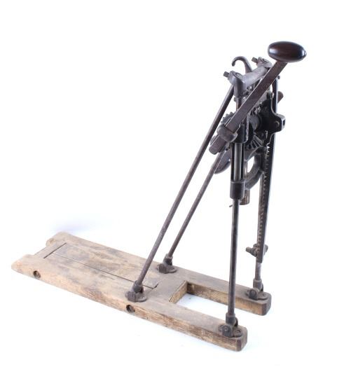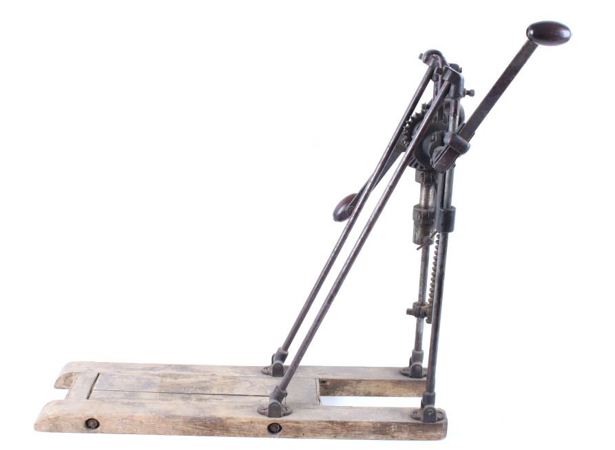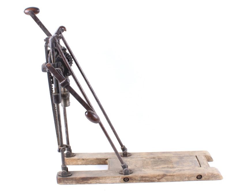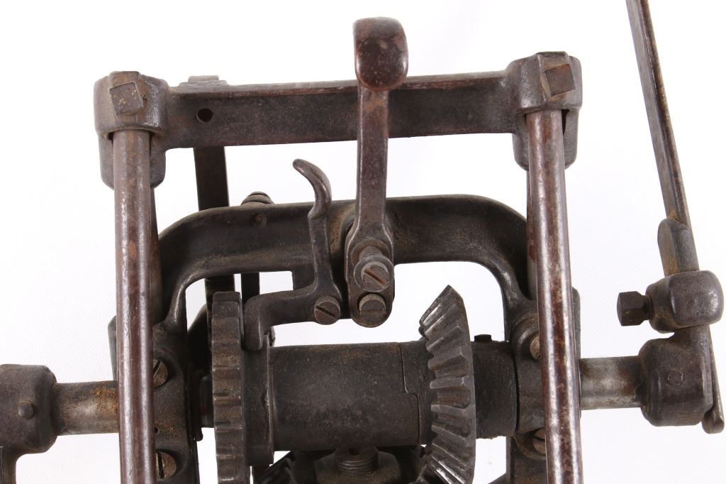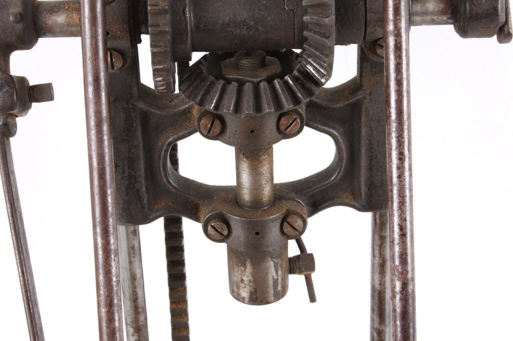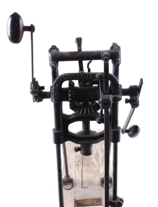 Included in this lot we have a Miller Falls hand crank boring machine originatin from the early 1900's. The machine was used to bore holes in large wooden beams for wood pegs to make mortise and tenon. The piece shows steel construction with a wooden base and crank handles. The machine shows a large gear system with a drill bit attachment point. The face of the piece is marked "M. F. Co., Miller Falls, Mass". The machine shows good condition overall with some wear due to age and use. The bore machine measures 25 1/2" tall by 27 1/2" long and 12 1/2" wide.