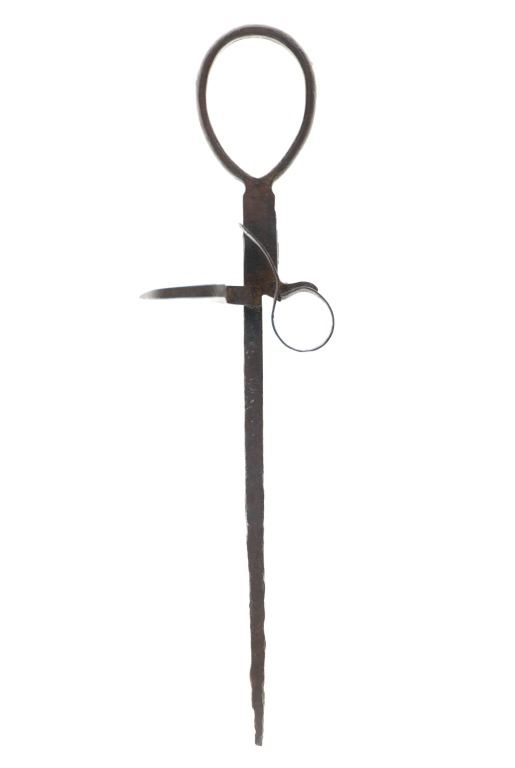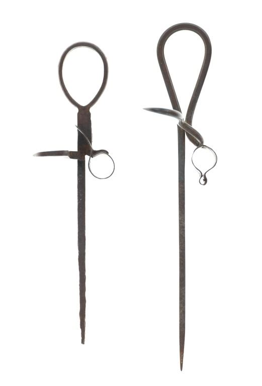 Featured in this lot is are two miners' candlestick holders. The holders were used in the mining of gold, silver and/or coal in the early 1900s. The two candlestick holders are what is called a High-Graders Candle stick holder. The miners candles stick is given the "Hi-Graders" name as the holder has a hollow loop in the inside of the handle where miners would steal the "HI-Grade" gold while mining. Once the early miners would find the "HI-Grade" gold they would wrap it in wax and press it into the hollow area, unnoticeable to their superiors. The candle stick holders have both a spike that can be driven into the rock or support timbers, and a hook to suspend it from a rock or timber. The first holder marked "Royal" measures 11 11/16" L x 2 1/2" W x 2 5/8" H, while the other marked "Hasta" measures 10 1/8" L x 2 3/4" W x 2" H. The collective weight of the two candlestick holders is 8 ounces.*
