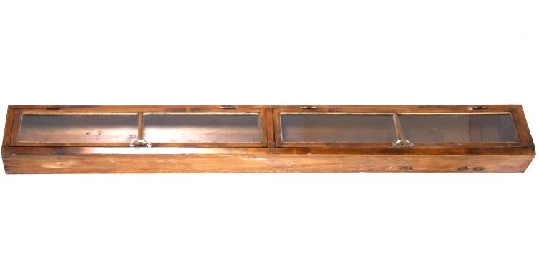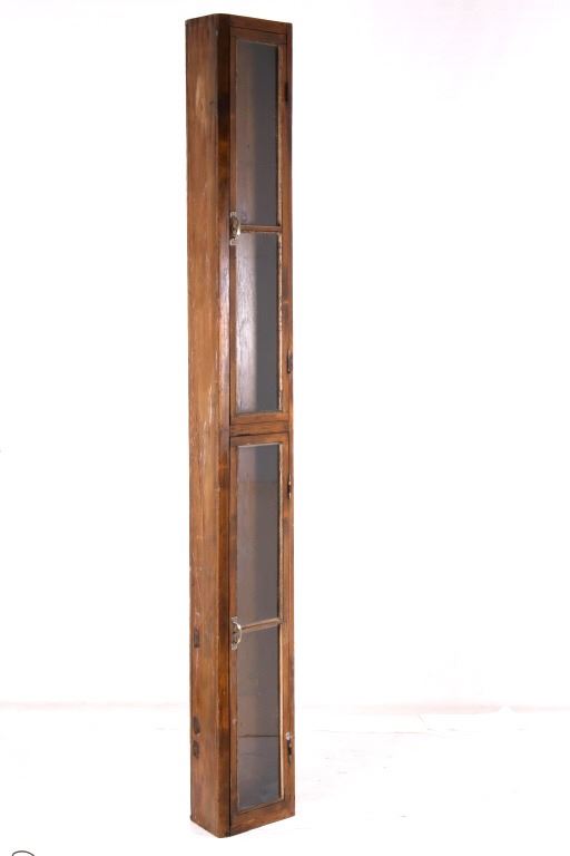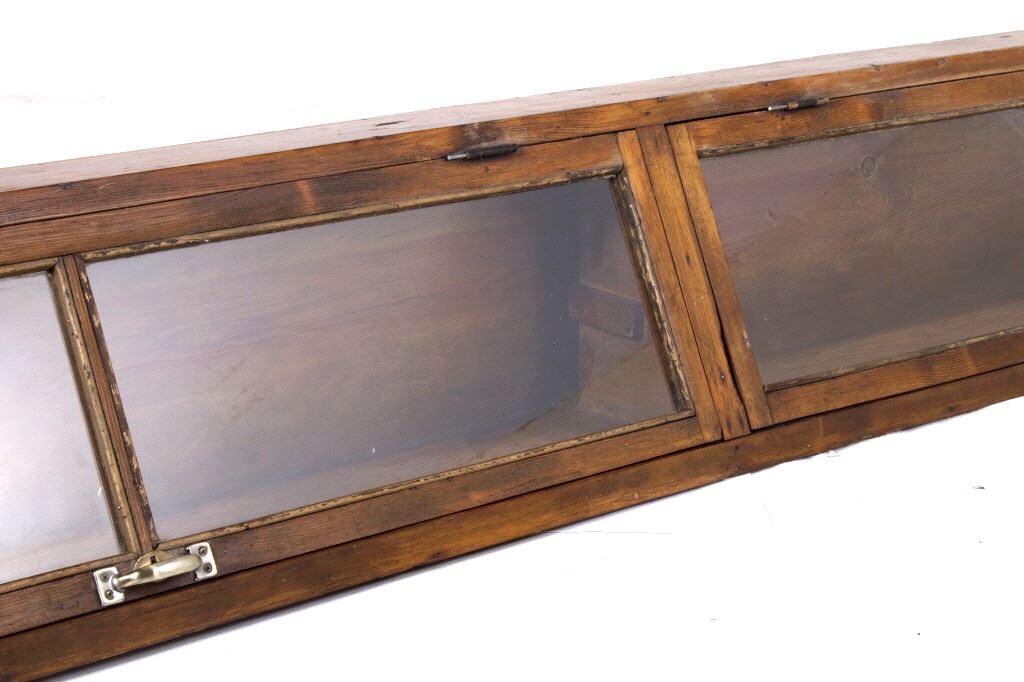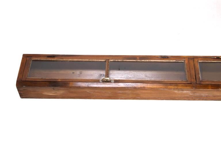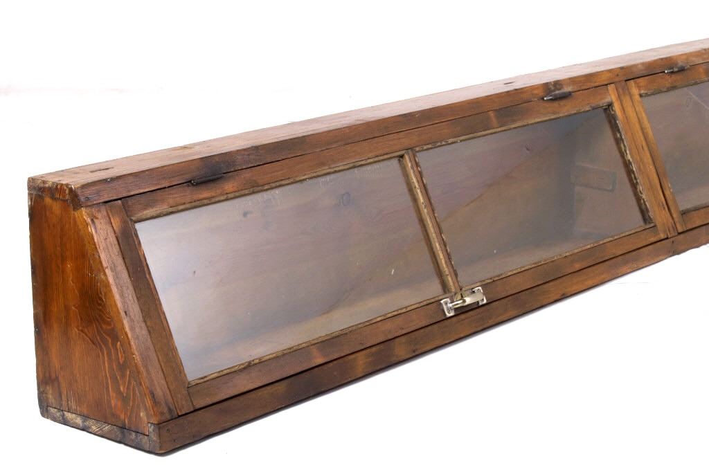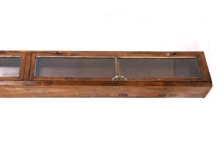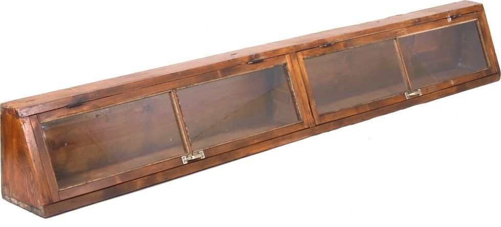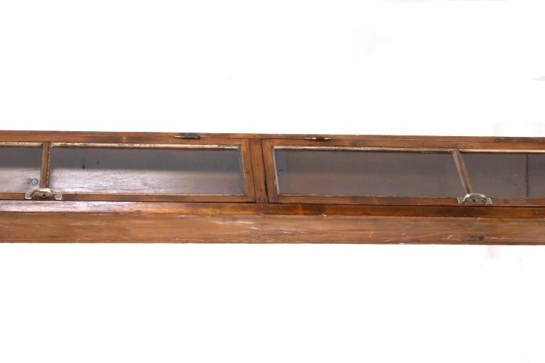 For your bidding pleasure is this Early 1900s Montana Mercantile Countertop Display. This is a unique countertop display showing two sides of the mercantile display. The two doors are hinged above the doors and open up to show presumably what would be displayed there for selling. Each door shows long glass windows with single handles centered on each door with a lock centered just behind the handle, there is not any keys that to accompany these locks but they look fashioned for old style skeleton keys. The display is in good condition and would fit practically in many locations of a mercantile store or shop. The measurements of this display are 13" x 97 1/4" x 9". + Cabinet