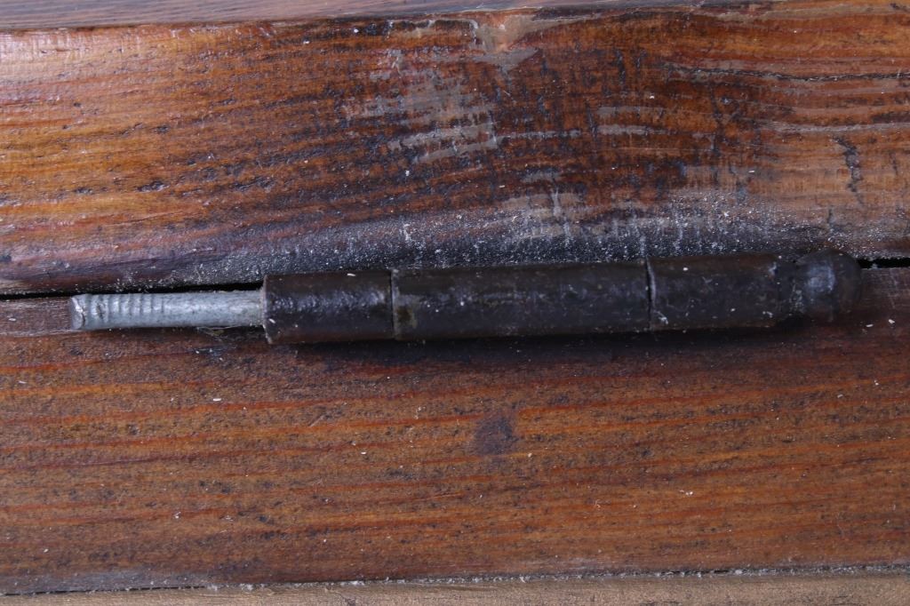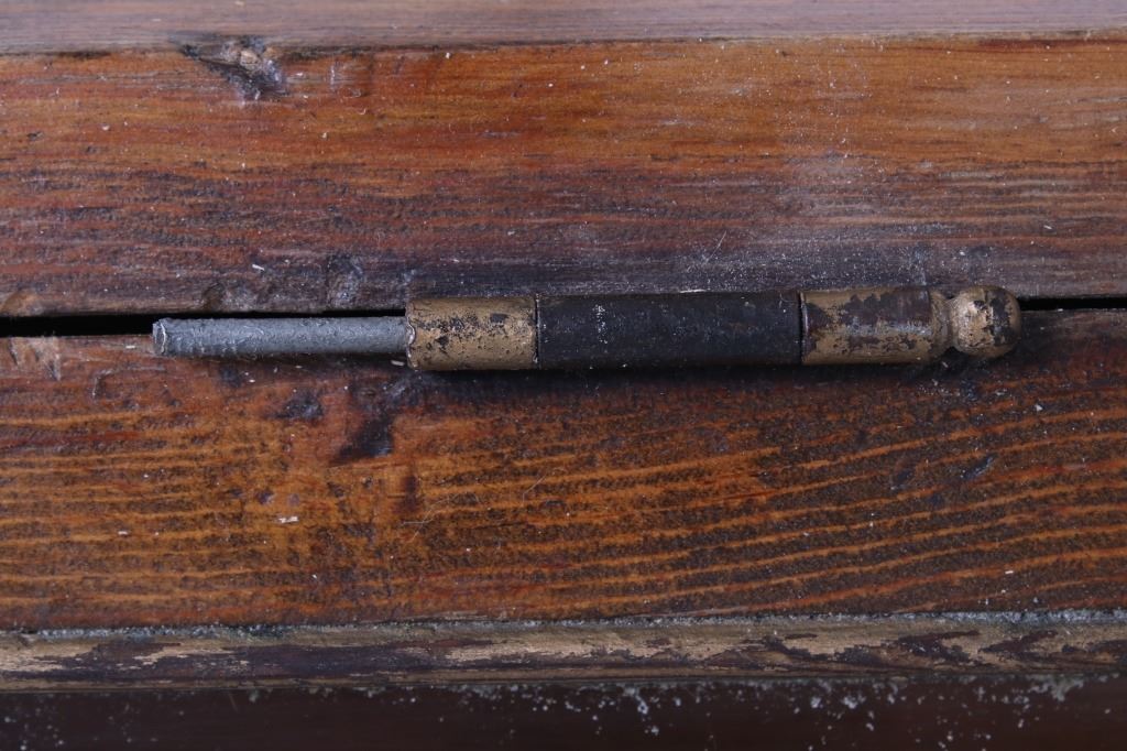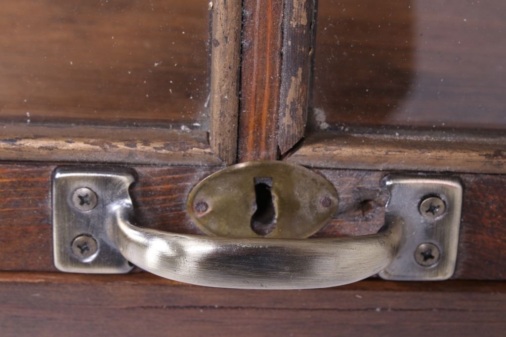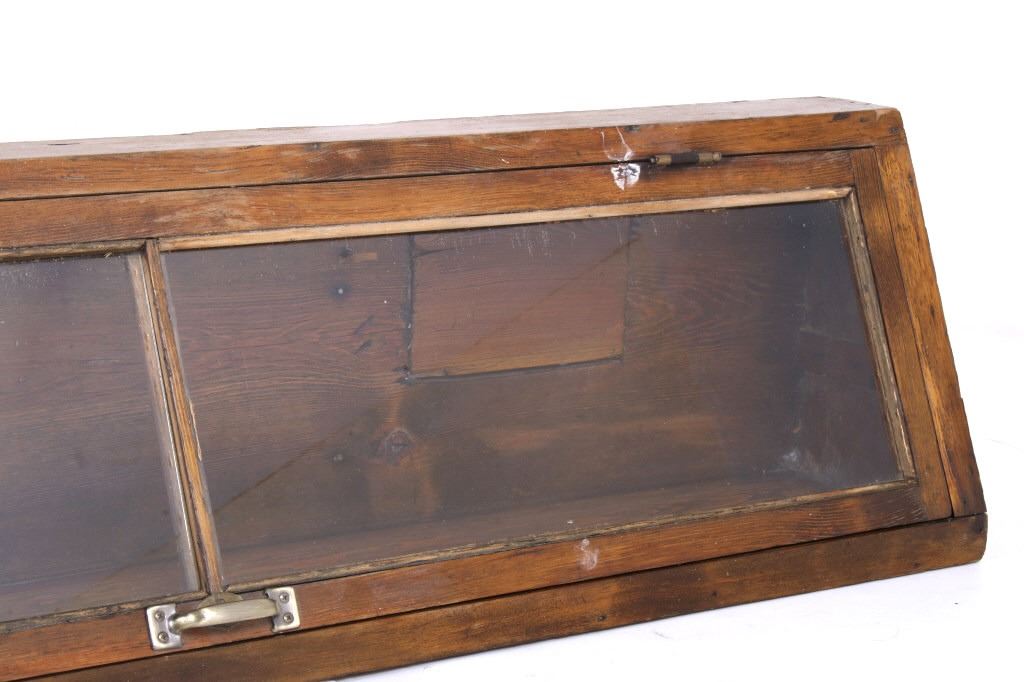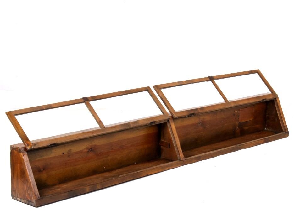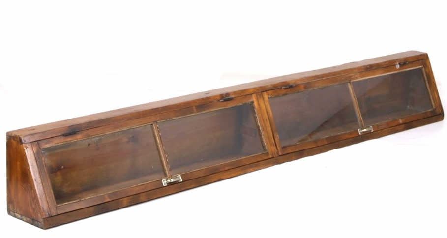 For your bidding pleasure is this Early 1900s Montana Mercantile Countertop Display. This is a unique countertop display showing two sides of the mercantile display. The two doors are hinged above the doors and open up to show presumably what would be displayed there for selling. Each door shows long glass windows with single handles centered on each door with a lock centered just behind the handle, there is not any keys that to accompany these locks but they look fashioned for old style skeleton keys. The display is in good condition and would fit practically in many locations of a mercantile store or shop. The measurements of this display are 13" x 97 1/4" x 9". + Cabinet
