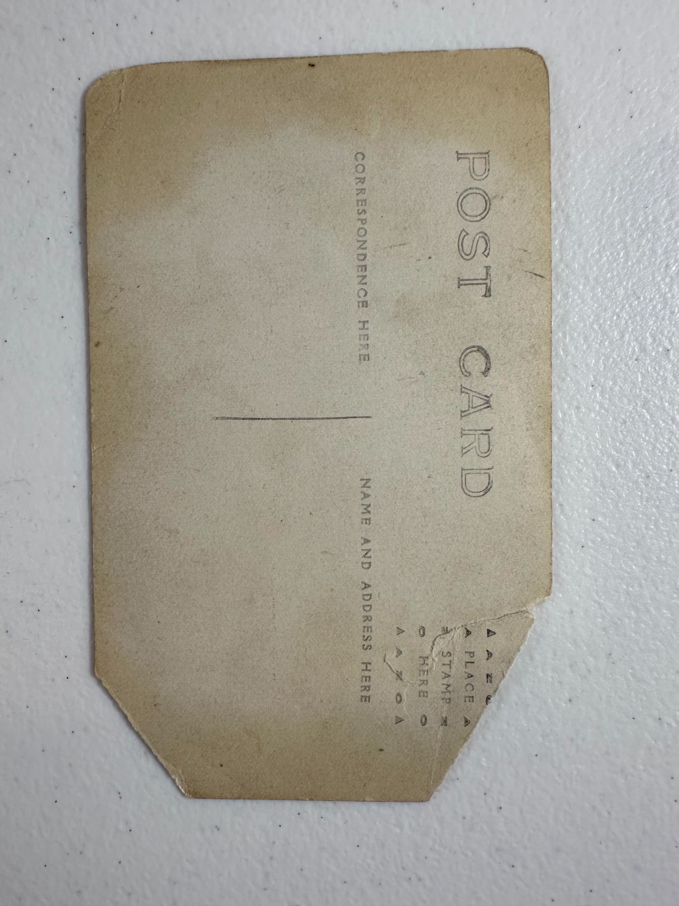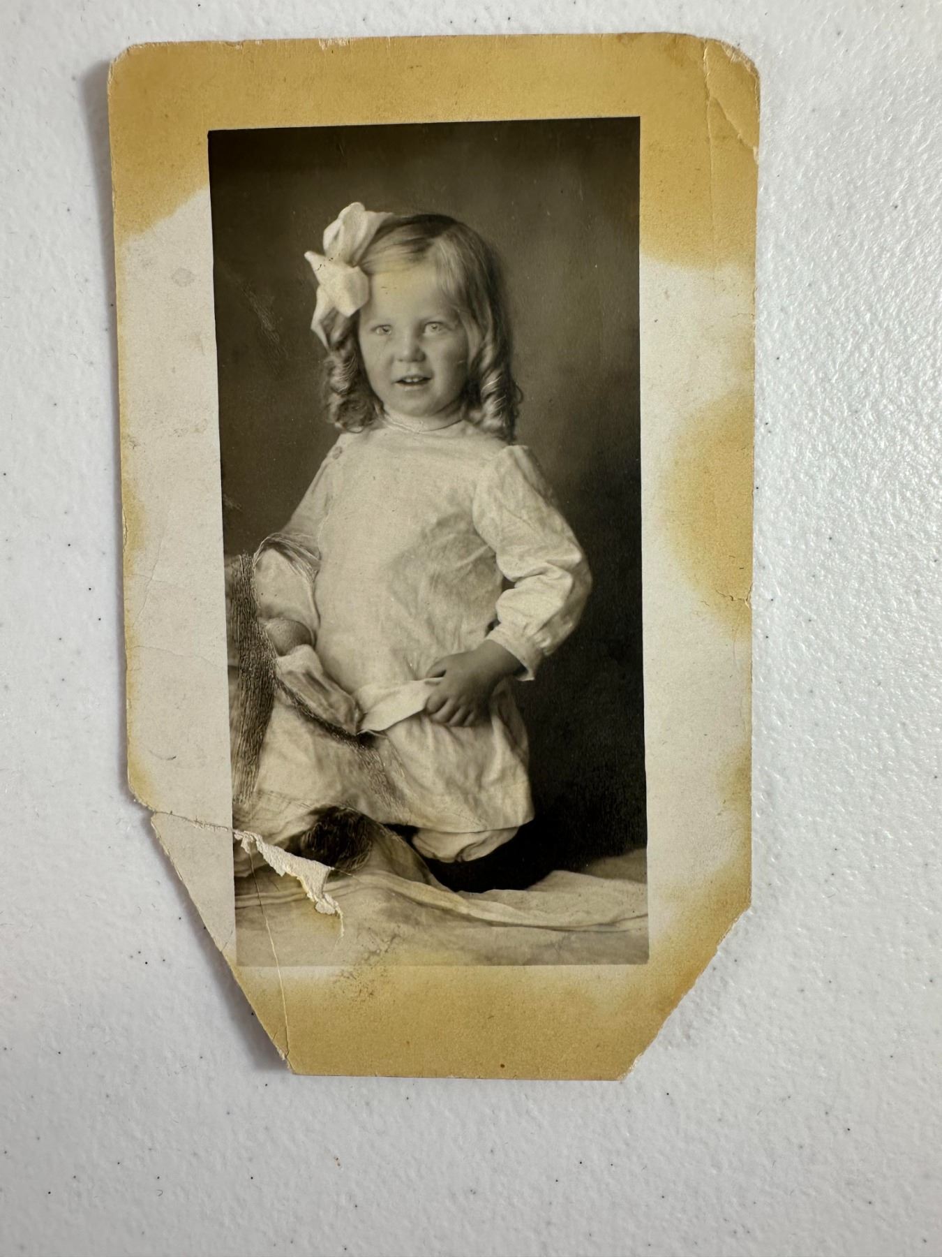 RPPC studio portrait of a young girl with curled hair and large white bow. Divided back. Sepia tones. Condition: Edge wear, corner tears, light staining.