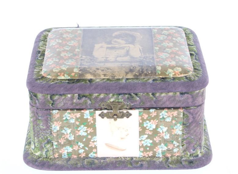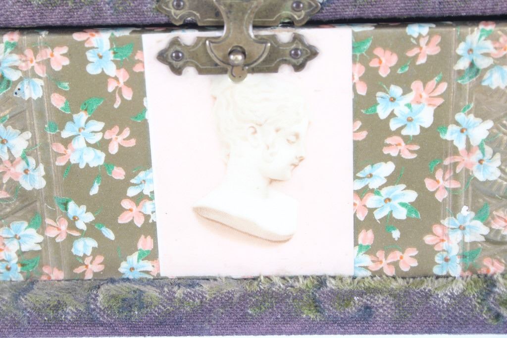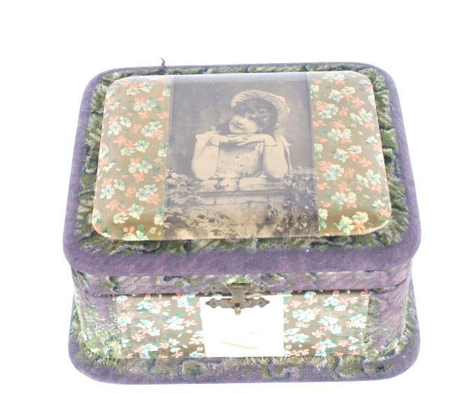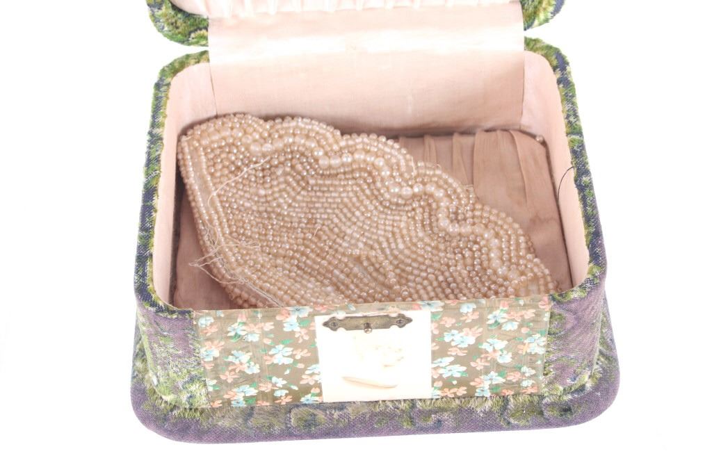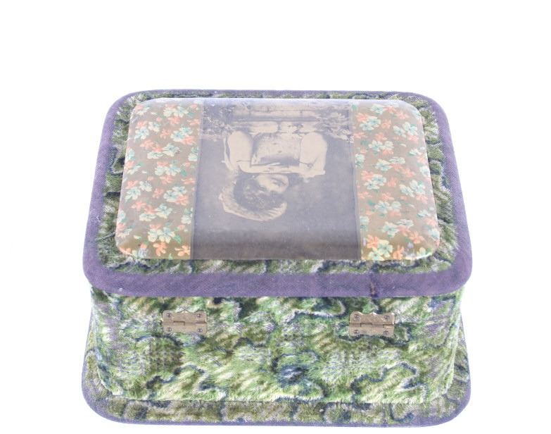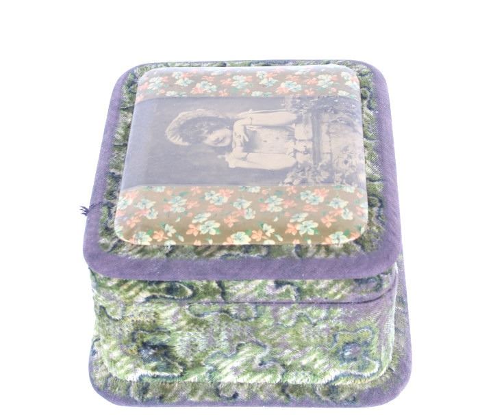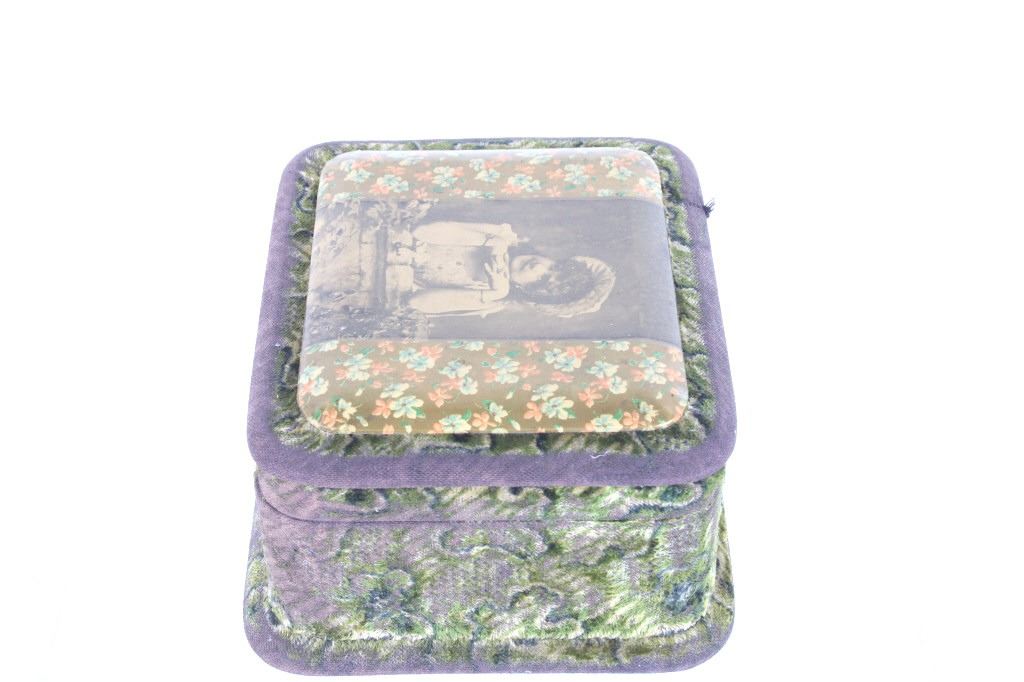 Featured in this lot is an early 1900s vintage handkerchief box. This handkerchief box has been passed through five generations an is around 100 years old. The box features a black and white photo of a woman on the top with a gold background and floral designs. The whole box is covered in a multicolored suede material with colors of green, deep purple, black and deep blue in a swirling design. The front has a small metal clasp to securely close the box. Just below that is an image of a sculpture that depicts a woman's head, with floral designs around it. The inside of the box features a fine cloth liner with a beaded handkerchief bag that has a zipper. Overall the box is in good condition with no signs of obvious damage. The box shows very light wear. A perfect vintage addition. The box measures 6 1/2" L x 7 1/2" W x 3 1/2" D.