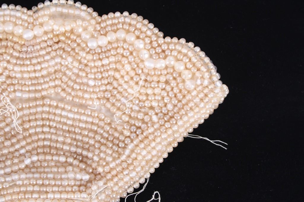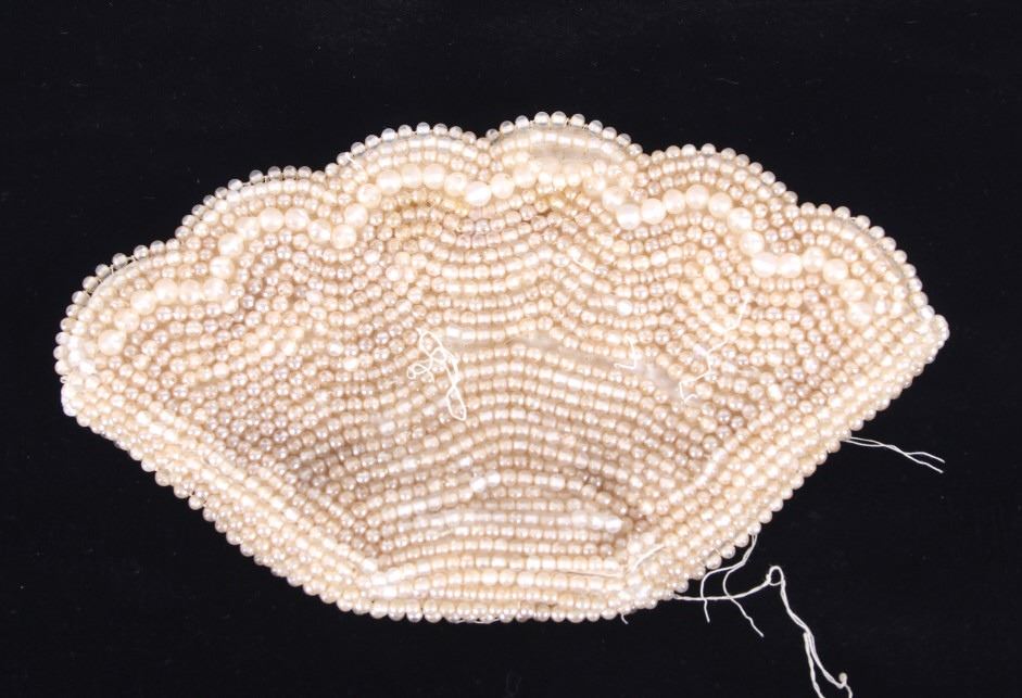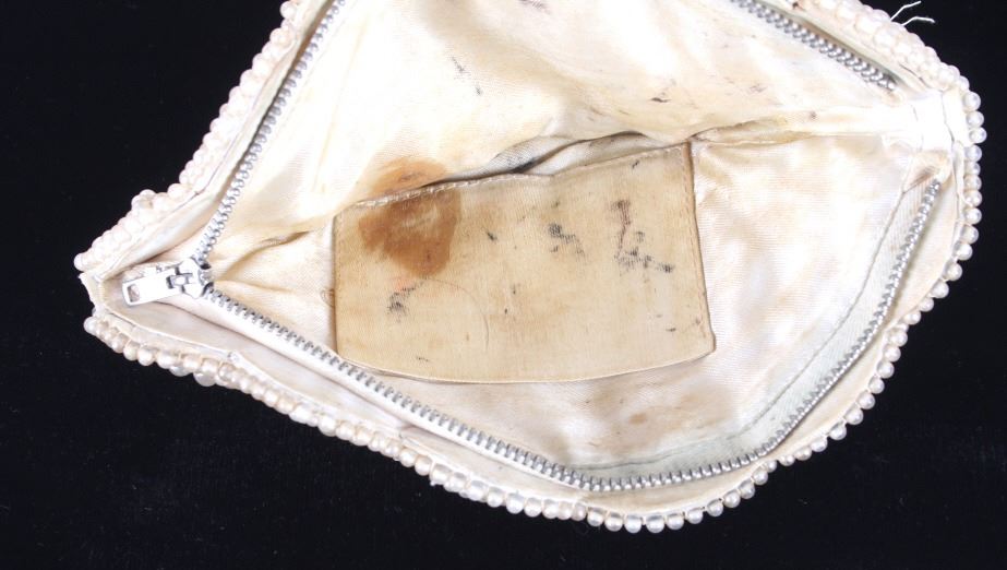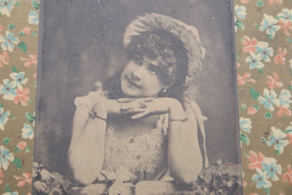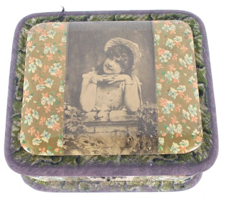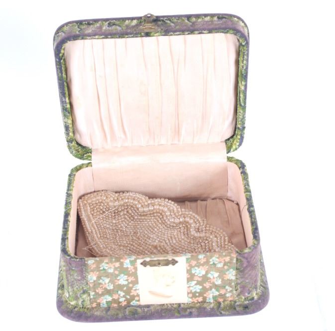 Featured in this lot is an early 1900s vintage handkerchief box. This handkerchief box has been passed through five generations an is around 100 years old. The box features a black and white photo of a woman on the top with a gold background and floral designs. The whole box is covered in a multicolored suede material with colors of green, deep purple, black and deep blue in a swirling design. The front has a small metal clasp to securely close the box. Just below that is an image of a sculpture that depicts a woman's head, with floral designs around it. The inside of the box features a fine cloth liner with a beaded handkerchief bag that has a zipper. Overall the box is in good condition with no signs of obvious damage. The box shows very light wear. A perfect vintage addition. The box measures 6 1/2" L x 7 1/2" W x 3 1/2" D.