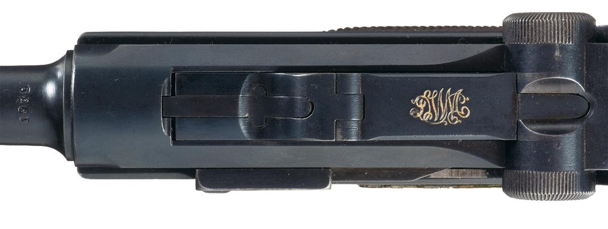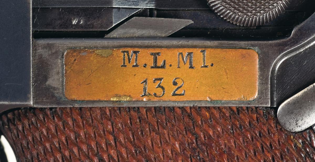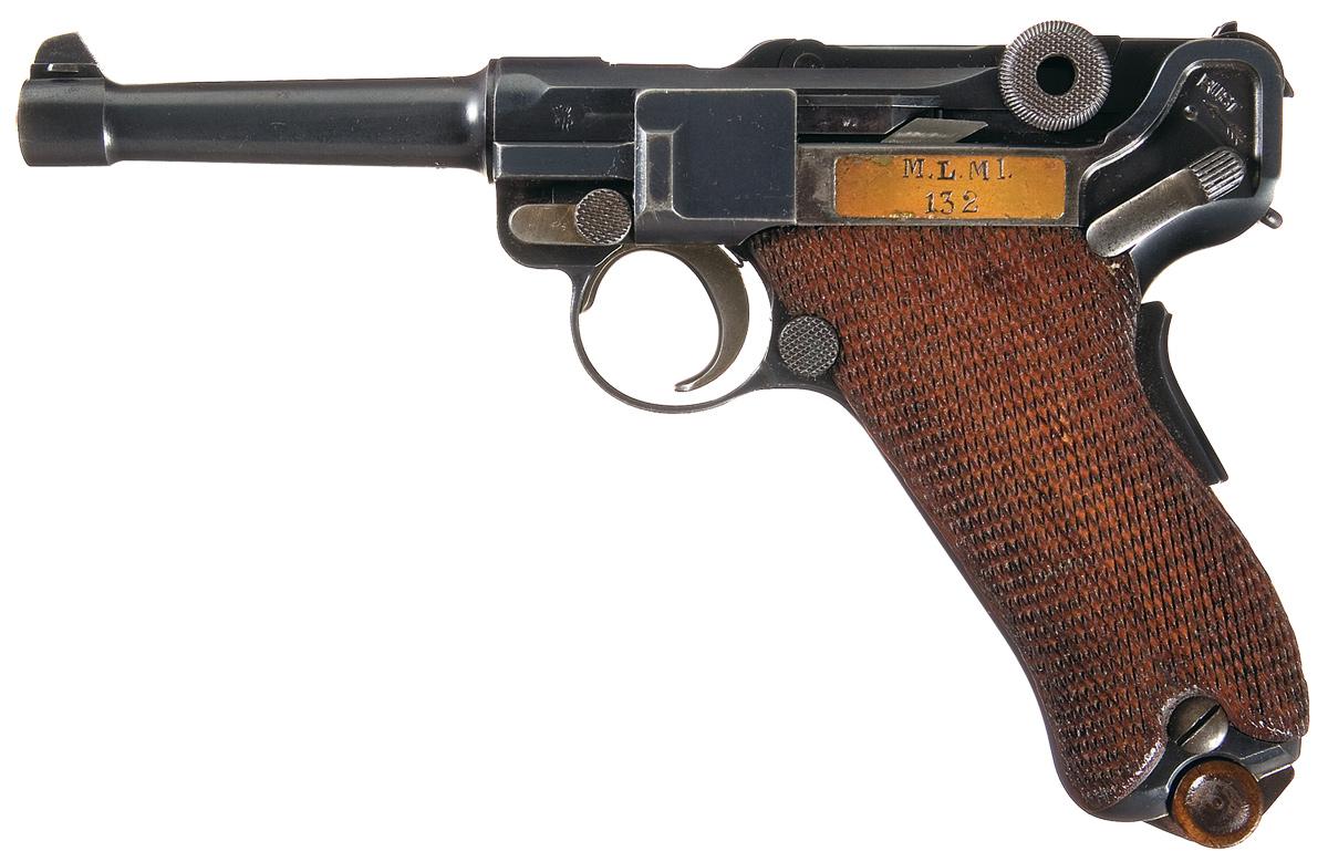 This is a fabulous example of a very rare early 1906 Dutch contract luger as produced by DWM for the Netherlands. The Netherlands like the Swiss were faithful users of the German Luger pistol with several orders being placed with DWM over the years. Examples are fairly rare in this country and especially RARE with the Significant level of finish such as this example displays. These pistols are very distinct in that they have "GELADEN" marked on both sides of the extractor, a brass unit ID tag fixed to the side of the frame that was applied after receipt by the Dutch and the safety area is marked "RUST" in-lieu of "Gesichert" on the German models. They have the same 1906 style frame with the grip safety with no provisions for a stock lug with all other features being the same as on the German models. The serial number of this pistol places production fairly early in the production run. The top of the chamber is blank and the toggle is marked with the DWM logo. The barrel extension is only marked with the small Crown over the letter "W" for Wilimenia and the underside of the barrel has the frame serial number with a small rework proof underneath that. The top of the barrel is stamped "1939" which indicates the year that this specific pistol was refurbished by the Dutch and it has the correct late style coarse checkered replacement grips that were also installed during the refurbishment. Both of which are correctly numbered (matching) on the back side of each grip panel. It is complete with one original Dutch magazine that has a nickel plated body with a wooden base similar to a WWI navy model but without the circular rings. The pistol has an all rust blued metal finish with straw colored small parts with the coarse checkered walnut grips.