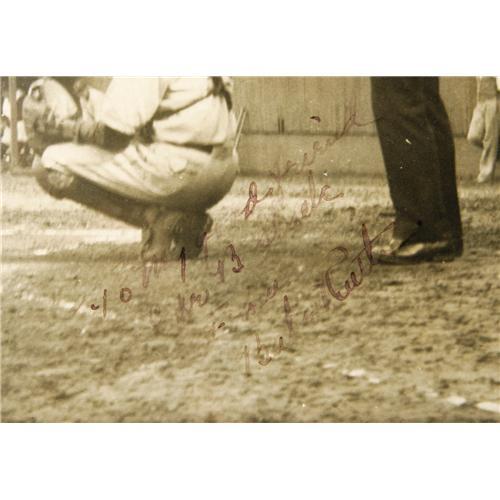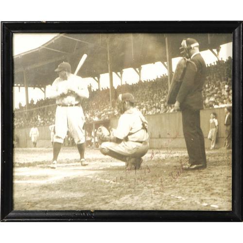 <B>Early 1930's Babe Ruth Signed Photograph.</B></I> One of a kind image was snapped by a professional shutterbug at a Yankee Spring Training event, quickly developed, and then presented to the subject for his autograph. The 8x10" photo is a spectacular study of the Babe at bat, with the Yankees dugout and a couple of neighborhood kids looking on from the background. The black fountain pen inscription reads, "To my good friend Erle B. Slack, From Babe Ruth," with boldness of the ink averaging about 5/10. The photo itself is free of any creases, stains or tears and presents perfectly in its original frame. A terrific Ruth piece for the collector looking for something truly unique. <I>LOA from PSA/DNA.</B></I>