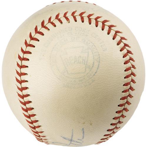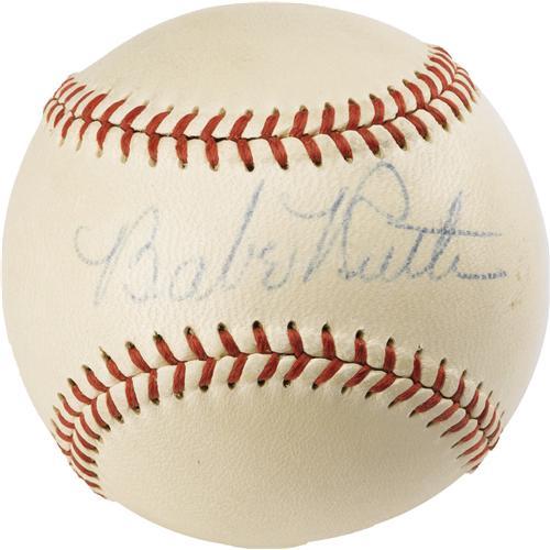 <B>Early 1940's Babe Ruth Single Signed Baseball.</B></I> A milky-white OAL (Harridge) ball supplies the most desirable of homes for a strong sweet spot signature from the man who rose from a Baltimore orphanage to the pinnacle of international fame. The blue fountain pen ink rates an extremely conservative 8/10 in strength, and the ball couldn''t be more attractive, with just a couple very faint dots of toning well clear of the signature that have zero effect upon the visual power. The cornerstone of any serious baseball autograph collection, the Ruth single is an essential acquisition and one of the safest investments in the hobby. And when you buy quality, you''ll never regret it. <I>LOA from PSA/DNA. LOA from James Spence Authentication.</B></I><BR><BR><b>Shipping:</b> Balls, Pucks, etc., Small (<a target="_blank" href="http://www.heritageauctions.com/common/shipping.php">view shipping information</a>)