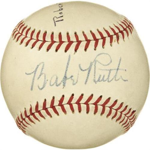 <B>Early 1940's Babe Ruth Single Signed Baseball.</B></I> Absolutely exceptional specimen will serve as the cornerstone of the finest of Hall of Fame single signed baseball collections. Ideal in all regards, the offering pairs a clean and milky-white OAL (Harridge) ball and a bona fide 9/10 sweet spot signature rendered in flowing blue fountain pen ink. A black ink notation in the autograph seeker's hand gifts this treasure to a lucky young collector, who clearly took great interest in the baseball's care. Babe Ruth autographs, and particularly those of the utmost quality, have been the hobby's most consistent and unshakeable performers in the hobby market for years, a trend which will almost certainly continue as long as baseball is played. All indicators would suggest that this is one of the auction's safest investments. <I>LOA from PSA/DNA. LOA from James Spence Authentication.</B></I><BR><BR><b>Shipping:</b> Balls, Pucks, etc. - Encased, La (<a target="_blank" href="http://www.heritageauctions.com/common/shipping.php">view shipping information</a>)
