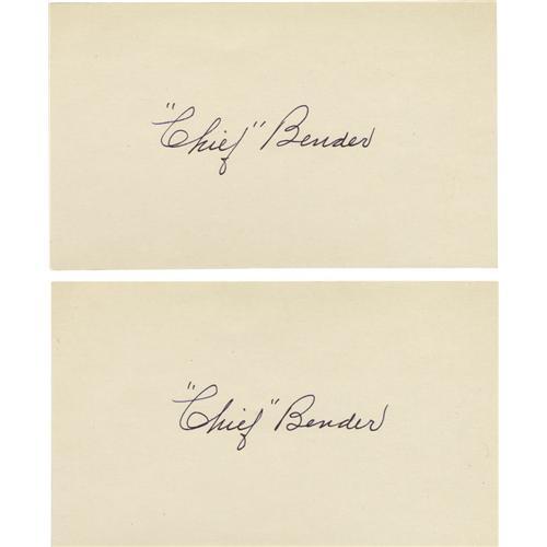 <B>Early 1950's Chief Bender Signed Index Cards Lot of 2.</B></I> "If I had all the men I've ever handled and they were in their prime and there was one game I wanted to win above all others, Albert would be my man," once said Connie Mack, who had such legends as Rube Waddell, Eddie Plank and Lefty Grove from which to choose. Bender's black ink signatures register as perfect 10/10 on blank 3x5" index cards. Keep one and sell the other. <I>LOA from PSA/DNA. LOA from James Spence Authentication.</B></I><BR><BR><b>Shipping:</b> Flat Material, Small (<a target="_blank" href="http://www.heritageauctions.com/common/shipping.php">view shipping information</a>)