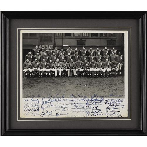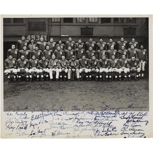 <B>Early 1950's New York Giants Team Signed Photograph with Two Steve Owen Autographs!</B></I> Just feet from the spot where Willie Mays made his famous 1954 World Series catch, the New York Football Giants pose for the photographers lens. While the vintage team shot on its own would be cause for celebration, the clear appeal here is the compilation of thirty-eight vintage autographs from the men pictured. Amazingly, only one autograph appears twice, that of coach Steve Owen, whose autograph on a photo books for $700 in Sports Market report on its own. Others present include future legendary coach Tom Landry, Kyle Rote, Em Tunnell, Arnie Weinmeister, Chas. Conerly and many more. The signatures remain very bold and legible, ranging from 6/10 to 9/10, with most solidly at the center of that range. A small degree of smearing certainly occured at the time of the signing as the photo was passed around with the ink still wet, but our catalog imagery will show that this is of minor concern. A touch of creasing and edge wear is likewise unobtrusive to the eye. The photo measures 8x9.5", and is matted and framed to final dimensions of 11.5x13.5". <I>LOA from PSA/DNA.</B></I> <BR><BR><B>Important notice:</B> Heritage usually auctions material at the rate of 200-250 lots per hour. On some occasions eBay Live bid software or the Internet may not be able to keep up with the pace of the auction. We recommend placing a realistic absentee bid now as insurance to avoid disappointment. Occasionally the auctioneer may eliminate or reject an eBay Live bid, and the auctioneer may also reopen a lot after the close of the eBay live bidding (usually because we missed an audience bid), and may reject your bid even if it shows you as the winning bidder. By bidding via eBay Live, you agree that Heritage may award the lot to another bidder at its sole discretion under the circumstances described above or any other reasonable circumstances. Since eBay bids are not shown to us until we open the lot on the floor, we treat those bids just like floor bids. In most cases the floor responds before the eBay bid is presented to us, due to Internet lag time, so for consistency we have made it a policy that floor bids are always considered first over tie eBay live bids. Also please note that all Heritage lots purchased through eBay Live carry a 22.5% Buyer's Premium. Please make sure you read the Terms and Conditions before you bid. This lot is being auctioned in conjunction with a live floor auction by Heritage Galleries & Auctioneers. All final auction and invoice information will be supplied by Heritage Galleries & Auctioneers, and all other information should be considered preliminary. Lot:19289 <BR><BR><B>Winning Notification and Billing:</B> After the FINAL session in this auction is complete, Heritage will send e-mail and snail mail invoices. This process normally takes several days. All final auction and invoice information will be supplied by Heritage Galleries & Auctioneers, and all other information should be considered preliminary. <BR><BR>This auction will be conducted on a live auction floor and over the Internet through eBay Live. If you choose to place an absentee bid, please take a moment to <font color='#0000ff'><u><a href='http://pages.ebay.com/liveauctions/help/before/laabsentee.html'>learn how eBay Live absentee bidding works</a></u></font><font color='#000000'>