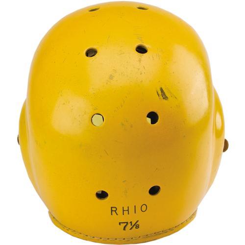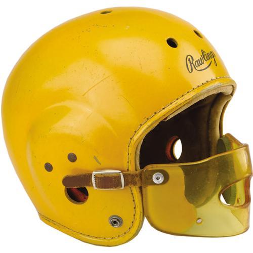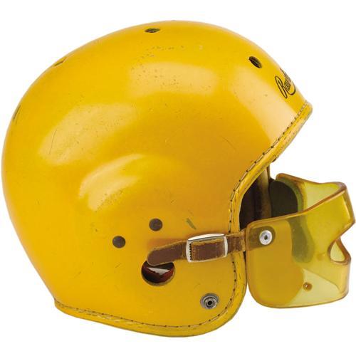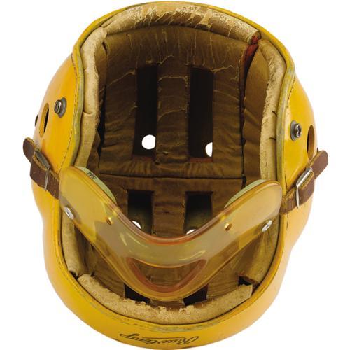 <B>Early 1950's Notre Dame Game Worn Helmet.</B></I> Almost certainly the oddest helmet ever worn on the gridiron by the Fighting Irish is this crazy yellow "Rawlings RH10" bubble-ear specimen with an even crazier clear yellow plastic face mask reminiscent of Hannibal Lecter's gear in "Silence of the Lambs." While any true Fighting Irish-man would likely balk at the color, it is a fact that Notre Dame briefly wore this "taxi cab yellow" color, as the gold paint would not adhere to the shell's surface, leading the team to abandon the style very soon afterwards. Padded leather interior shows strong use, and measures "7 1/8" in size. Face mask is affixed with original leather straps. No apparent player attribution. This is a piece for the Notre Dame collector who has it all. <I>LOA from Lou Lampson.</B></I><BR><BR><b>Shipping:</b> Miscellaneous Collectibles, Larg (<a target="_blank" href="http://www.heritageauctions.com/common/shipping.php">view shipping information</a>)