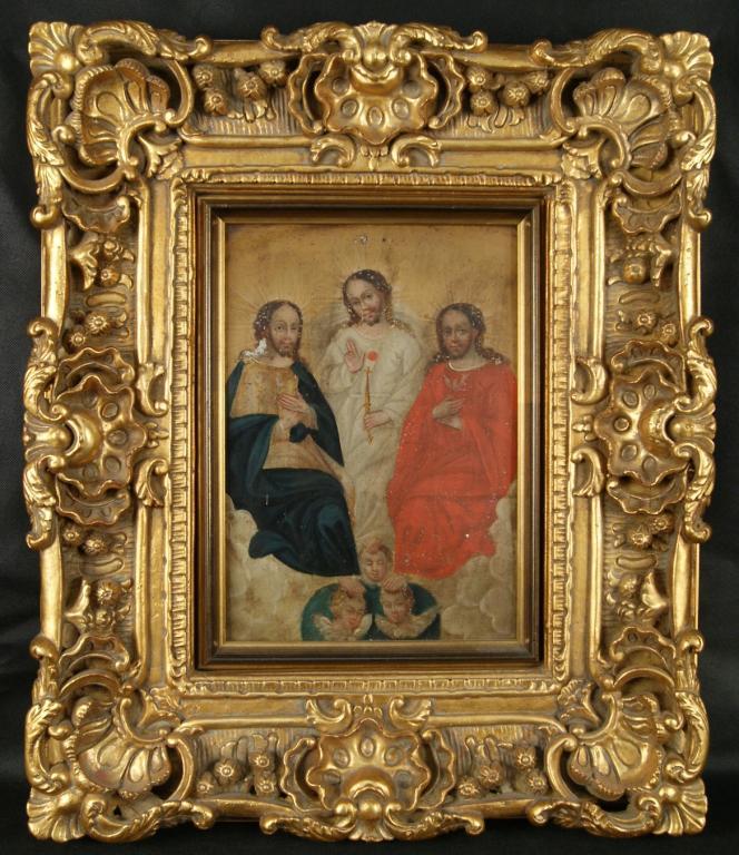 Early 19th C. Retablo on tin of the Holy Trinity 14" x 10" (13.5" x 9.5" visible)