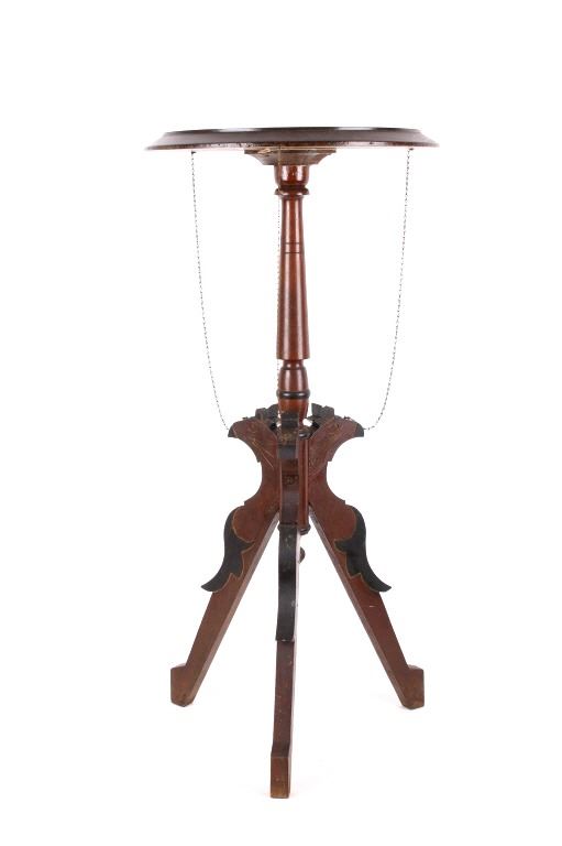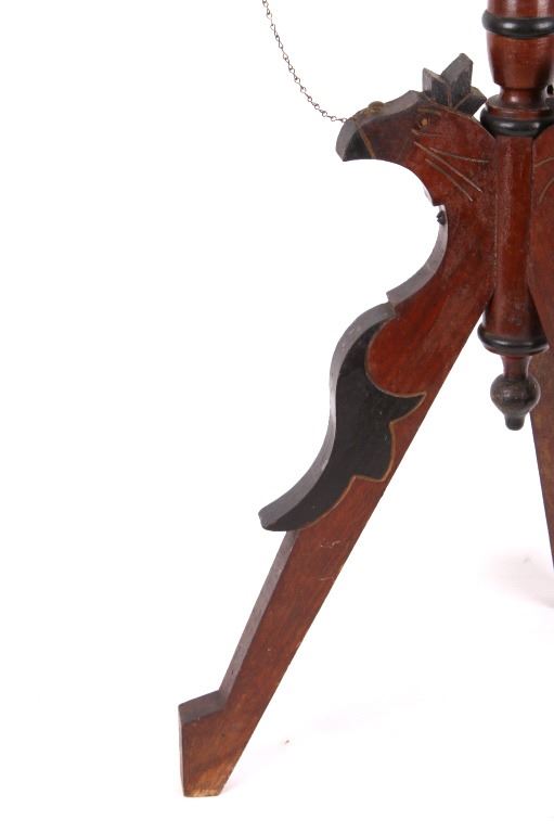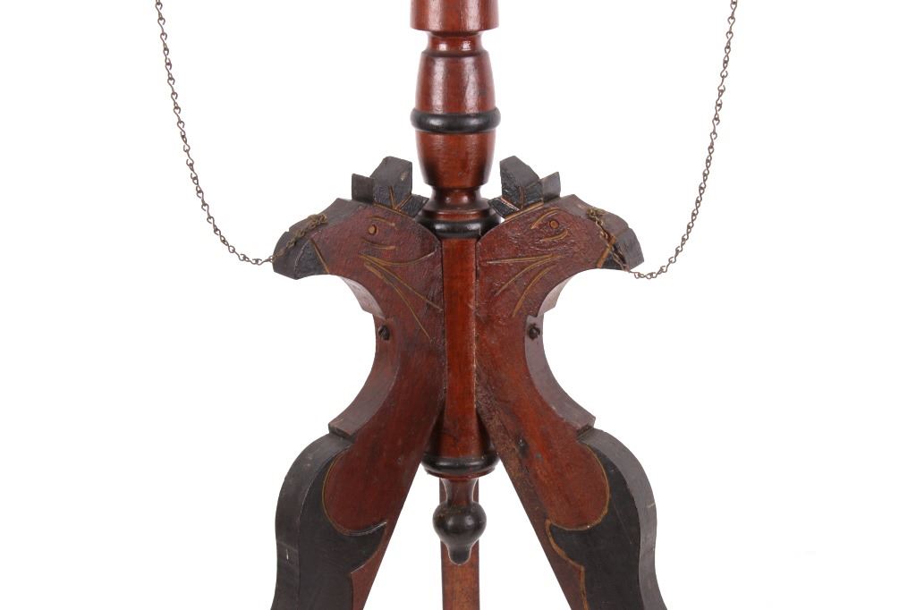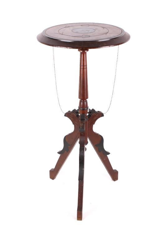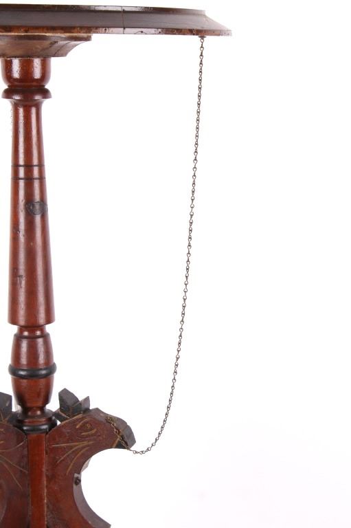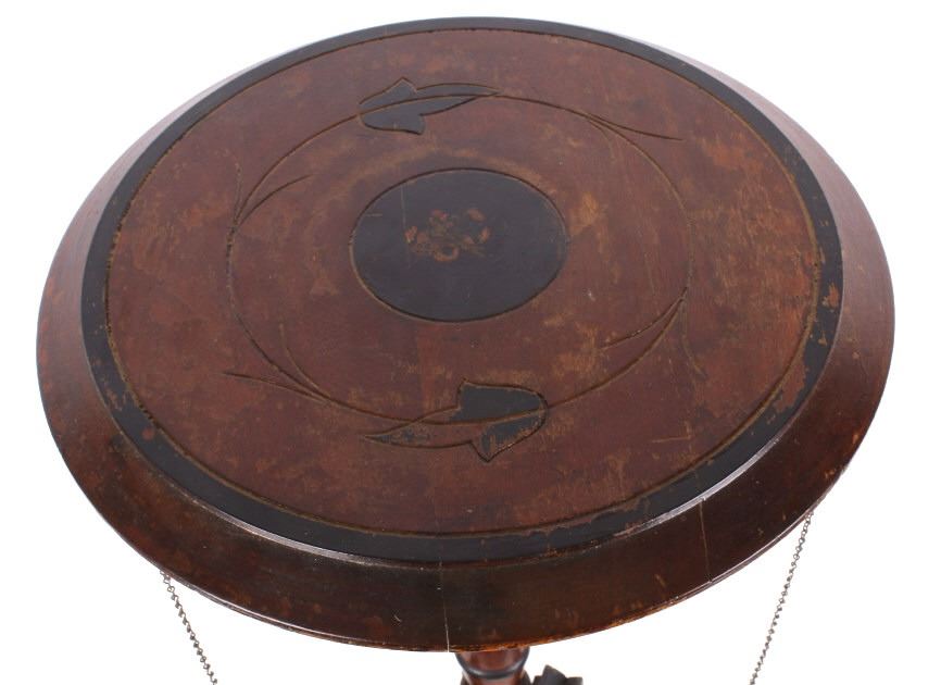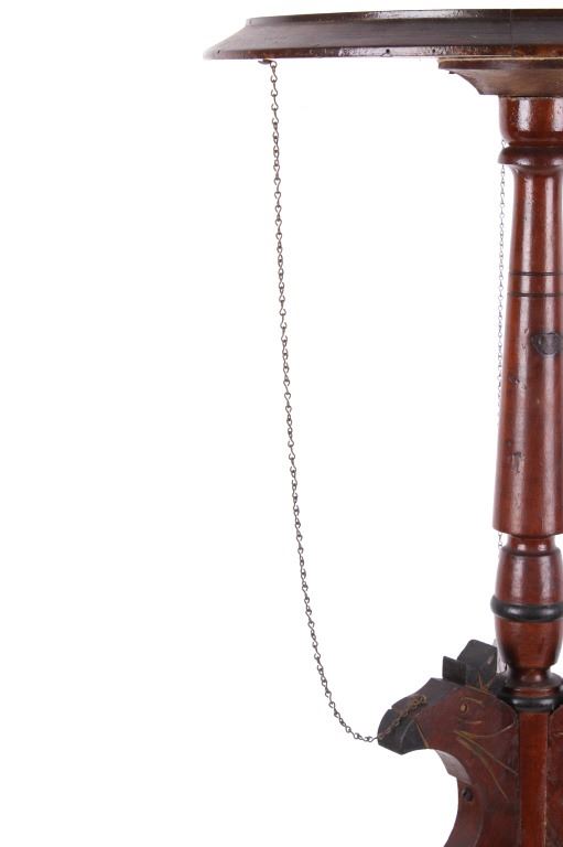 Available for your bidding pleasure is this Early 19th Century English Mahogany Table. This item is a gorgeous mahogany candle stand or side table, in the Queen Anne likeness. The table top sits prominently on a tripod base with carved legs. The legs display three wonderfully hand carved Parrots with a delicate chain leading from the Parrot's head to the underside of the table. The tabletop displays floral etching and design. This table is an exceptional example of early styling and shows very good condition overall with some wear indicative of age. The piece measures 32" tall and the tabletop measures 15" in diameter.