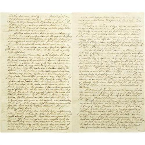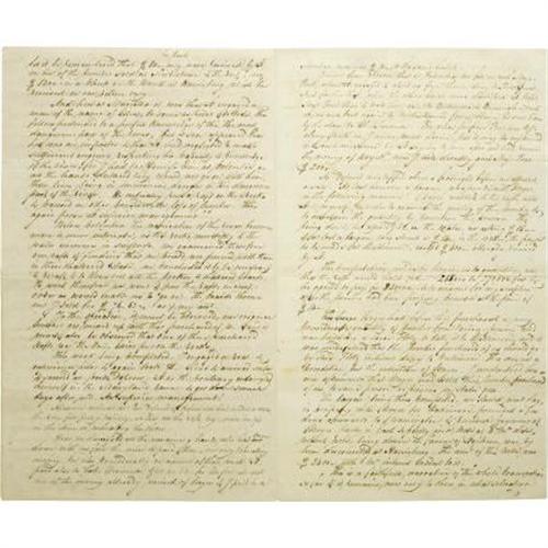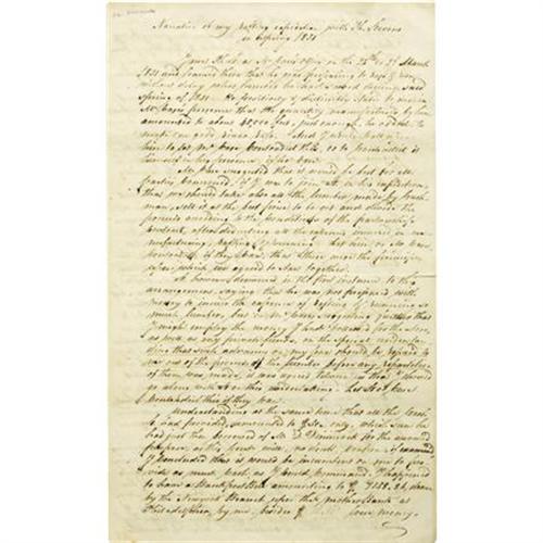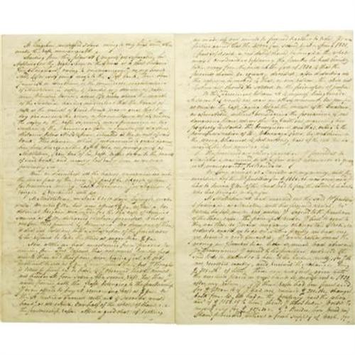 <B>Great Content Manuscript Entitled "Narrative of my Rafting Expedition with Th. Stevens in Spring 1831",</B></I> 8 pages, 8" x 13", n.p., circa 1831, being a highly descriptive account of a rafting expedition down a tributary of the Susquehanna River, beginning at "<I>Willcox's Tavern</B></I>" and ending at the "<I>Village of Port Deposit</B></I>" to transport a cargo of lumber. The narrative goes into great detail, start to finish, and includes the cost and actual construction of the rafts, the challenges of fording and running rapids, and the places visited along the way. A rich and graphic insight into the lumber industry in the early 19th century, as the Industrial Revolution is born. Pages are very lightly toned, with legible script in dark ink; overall condition is near fine. <I>From the collection of Henry E. Luhrs.</B></I><BR><BR><b>Shipping:</b> Flat Material, Small (<a target="_blank" href="http://www.heritageauctions.com/common/shipping.php">view shipping information</a>)