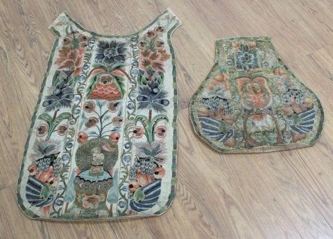 Hand embroidered silk, floral design. From a priest's collection. In Latin - SUNPSISSE SALUTIESI. 2-piece. Approx. 27 1/2" H x 24" W and 48" H x 26" W.