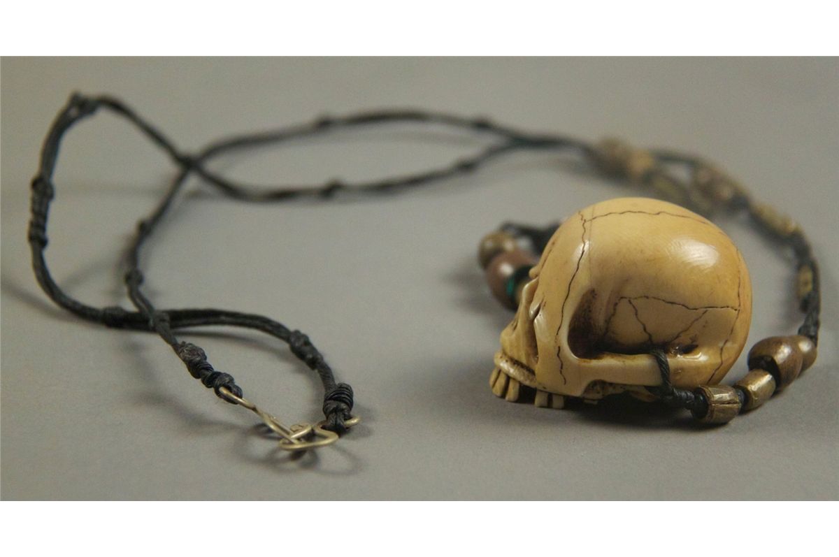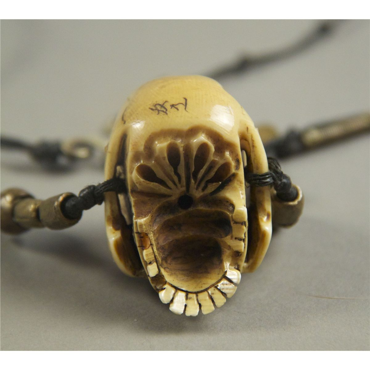 Early 19th Century finely carved Ivory Skull Netsuke with unknown signature and a later dated necklace. Necklace is 28 inches long. Ivory skull measures: [1.6 (oz), 1.35 (in), 1.25 (in), 1.75 (in)]