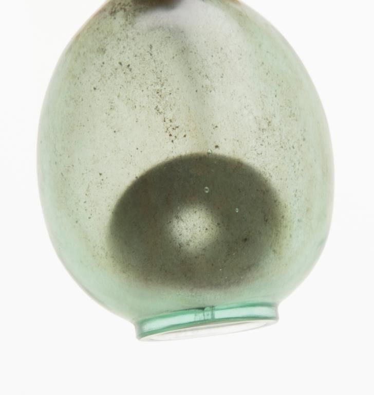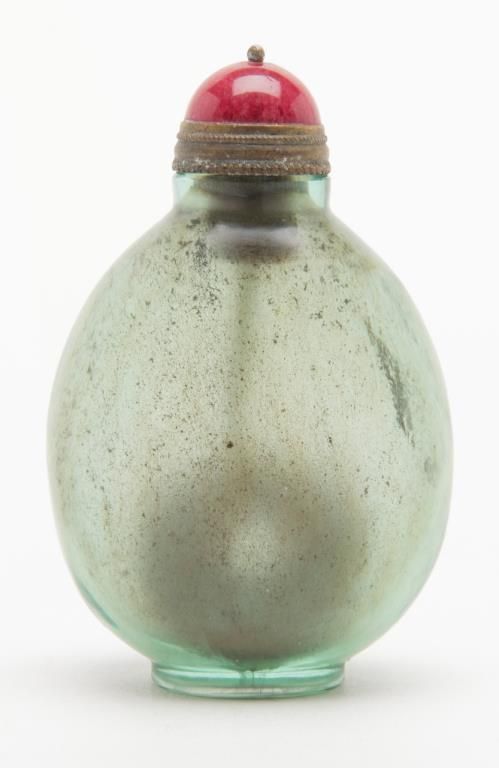 Early 19th Century glass snuff bottle with 2 ancient coins sealed in the interior. Very interesting and we have never seen another. Coins have square holes at center. Est.: $350 - $700