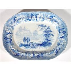 Early 19th century Turner blue and white transfer printed Villager patterned pottery meat plate, 28cm in length