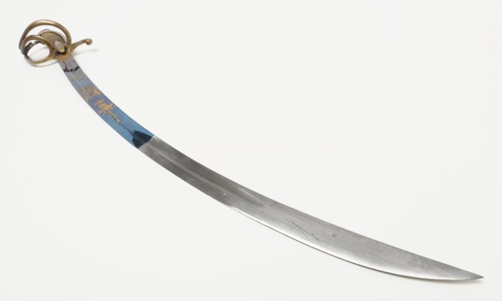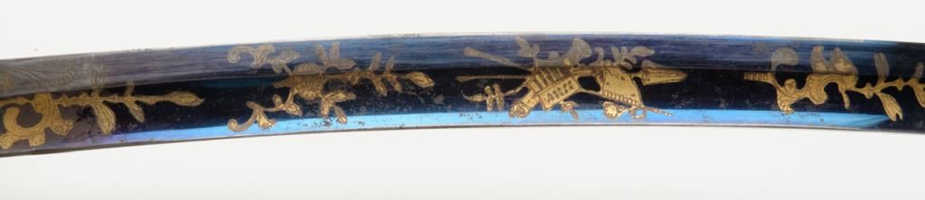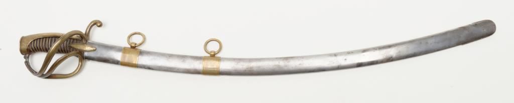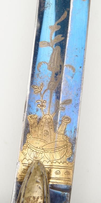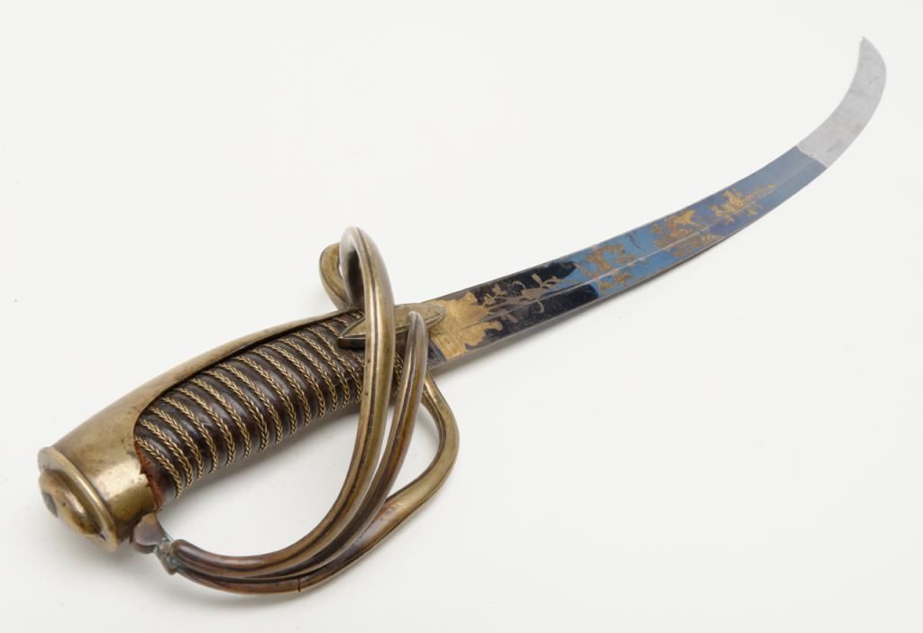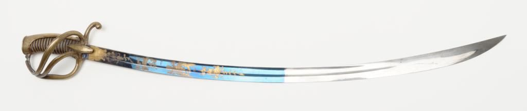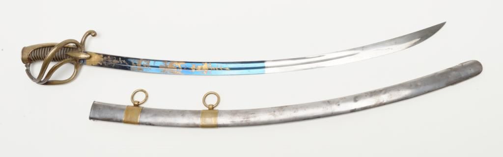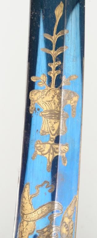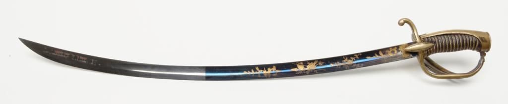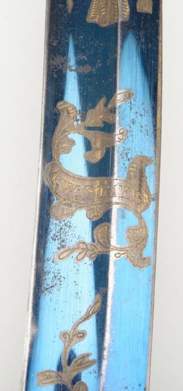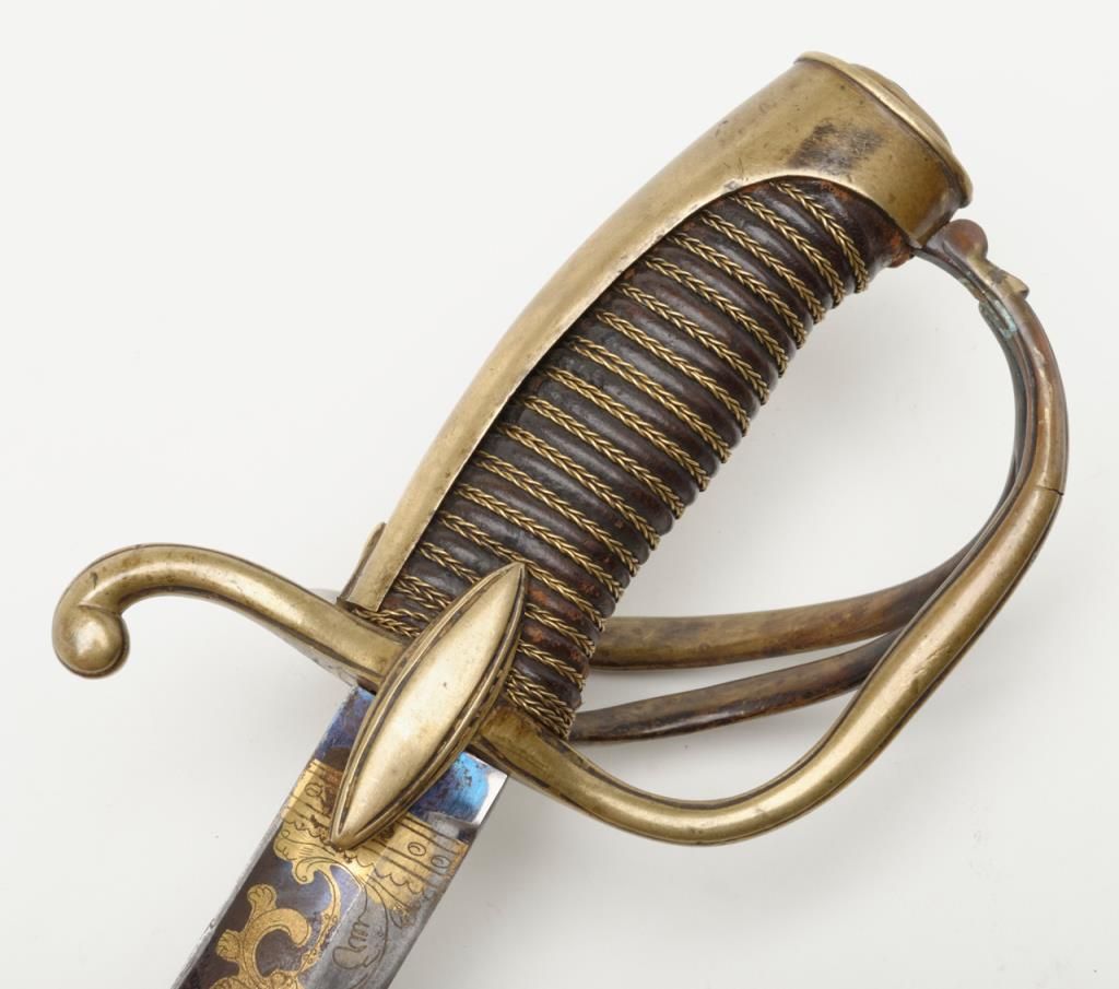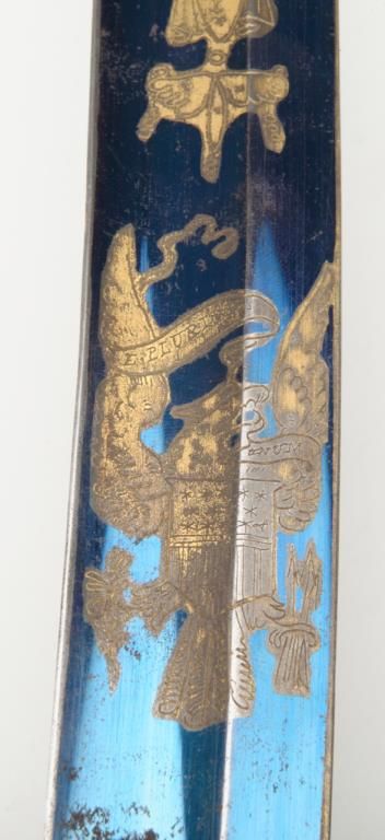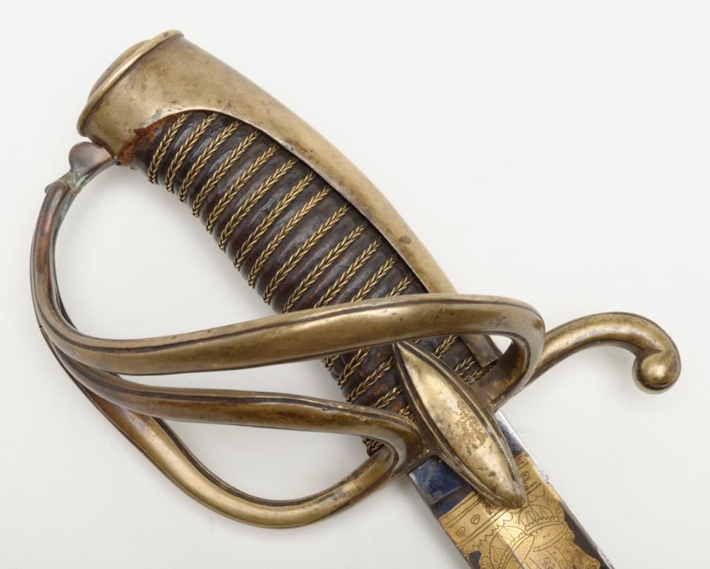 Early 19th century three branch D guard officer’s sword of French origin made for U.S. market showing bright blue and gilt blade with American Eagle, stand of arms and A.W. Spies importers or agents name. The sword measures 36” overall with31” blade and remains in near fine condition with 80% to 90% bright blue and gilt on the blade. The blade shows most of its original bright polish and just some minor spotting with minor normal aging. The wire wrapped grip is also very good plus. The scabbard shows a few dents but is also very good plus with brass hangers. Spies of New York name is found on many Eagle head style swords but this Napoleonic Dragoon size is unusual with American motifs and may be unique. Est.: $2250-$4500