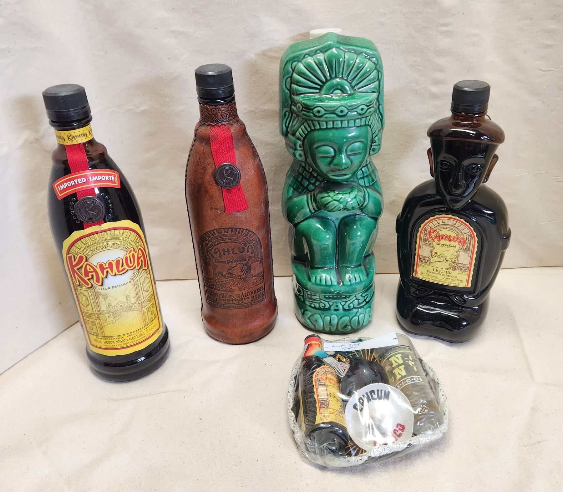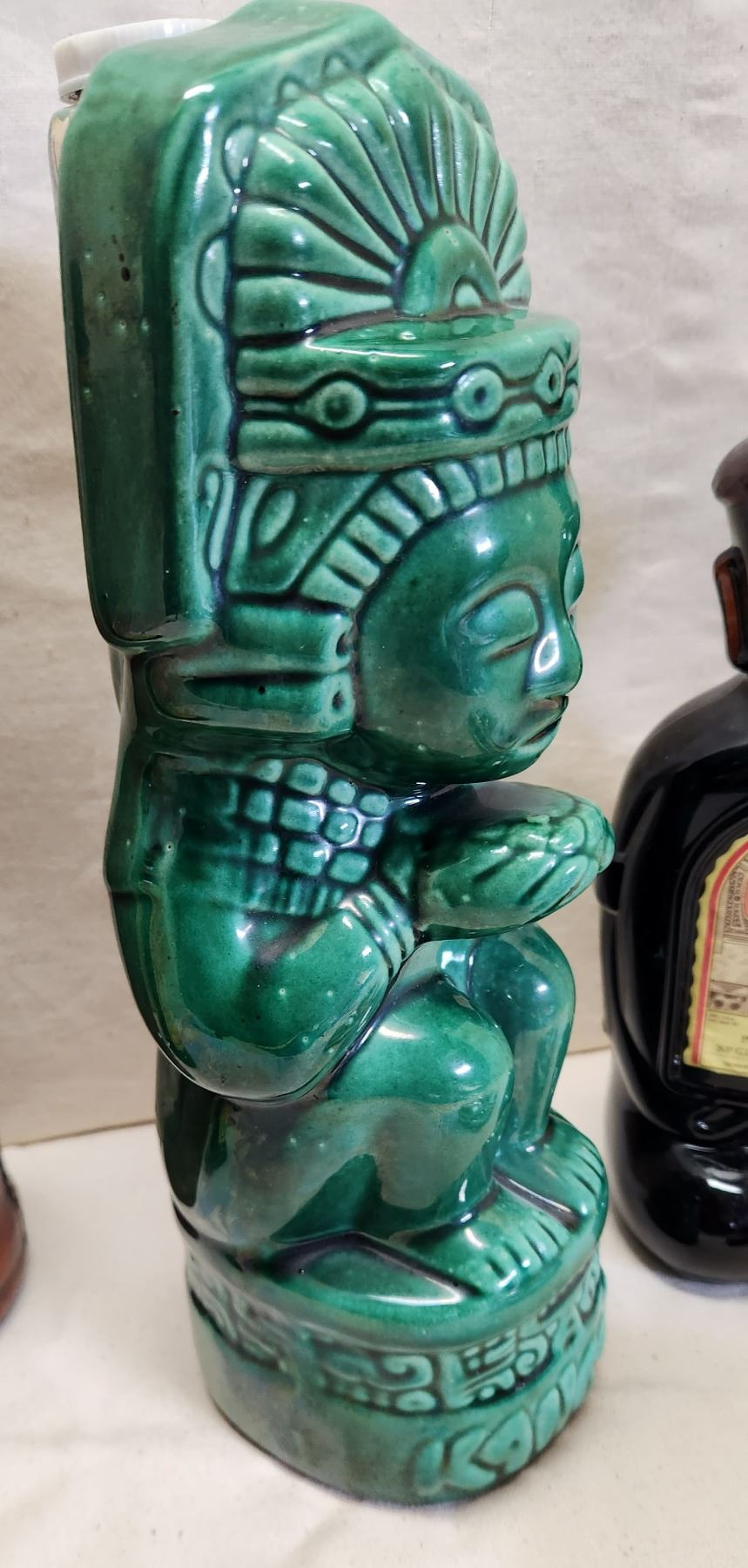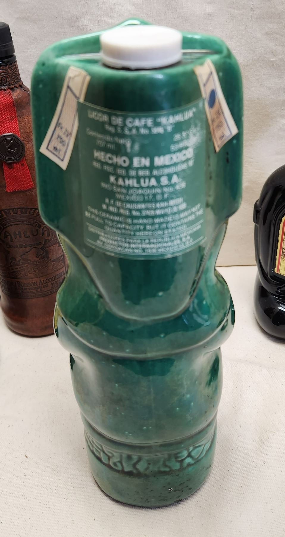 Four Larger Bottles- 26.5% alc./vol. 745ml. 20% alc./vol. 750 ml and 21% alc./vol. 750 ml. and one mini bottle at 26.5 alc./vol. 50 ml. Jade Green Mayan Ceramic Bottle is 53 proof 750 ml. Products of Mexico. Mini bottle comes with shot glass and two mini sombreros.