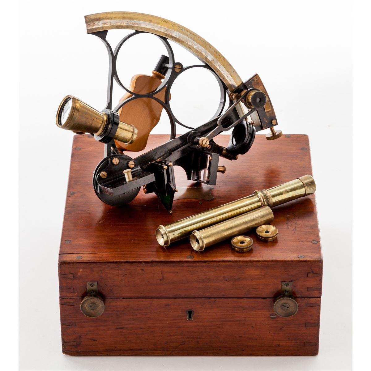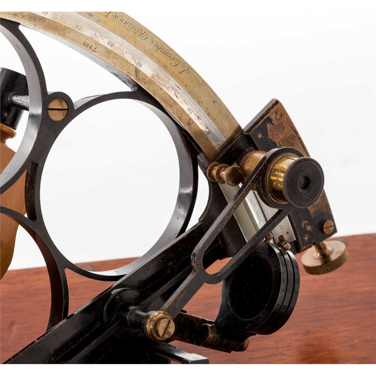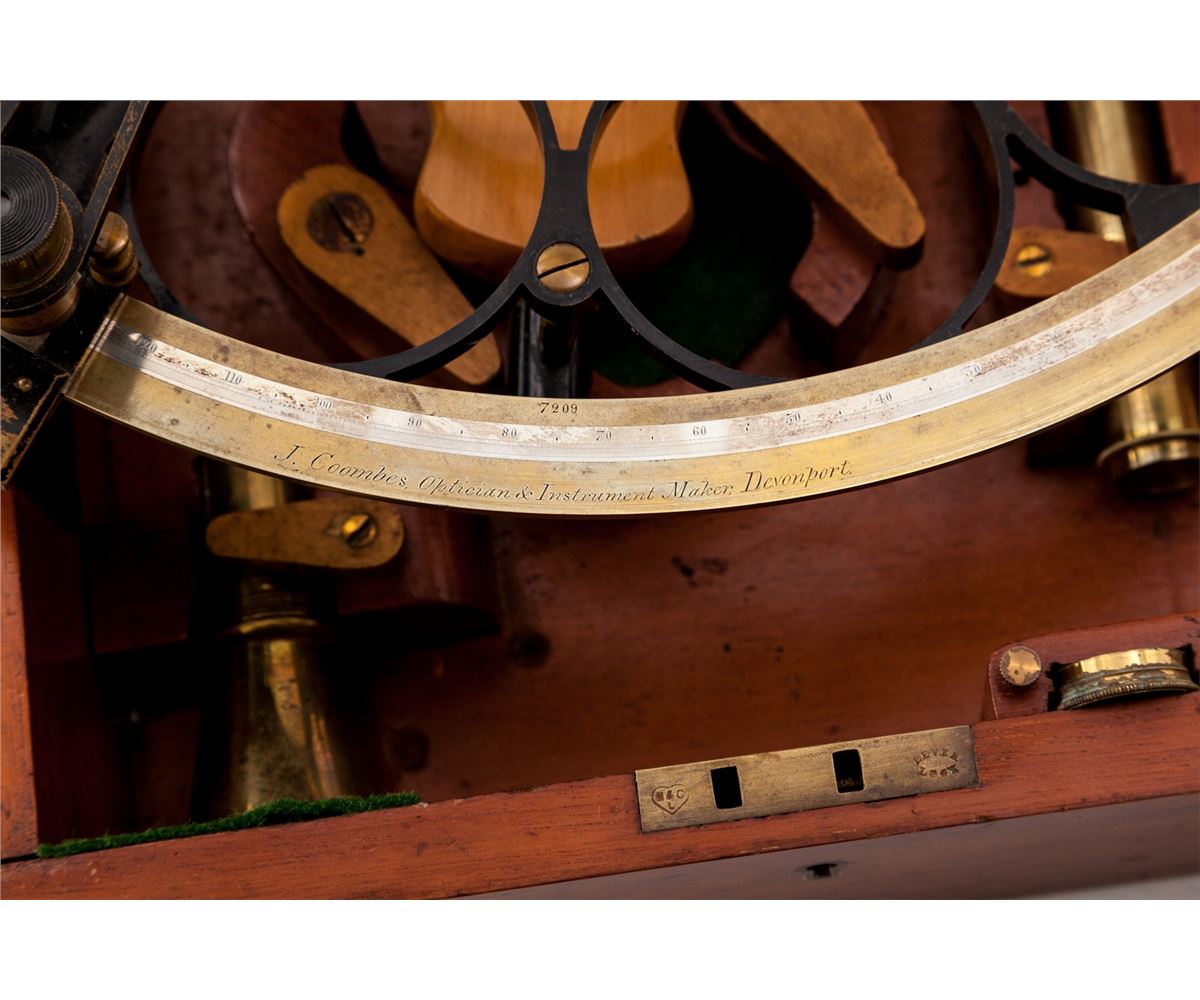 Early 20th Century English Marine Sextant, by Coombes, in mahogany case with all accessories. Gradiant portion marked ''J. Coombes, Optician & Instrument Maker, Devonport''. Condition is fine to near excellent with some paint loss to black portion. All filters and optical lenses are intact. Exterior of case shows just light scuffs and impressions, with one fracture near forward edge of lid that detracts little. Original iron key is present. A very nice nautical decorator. Est.: $500-$750.