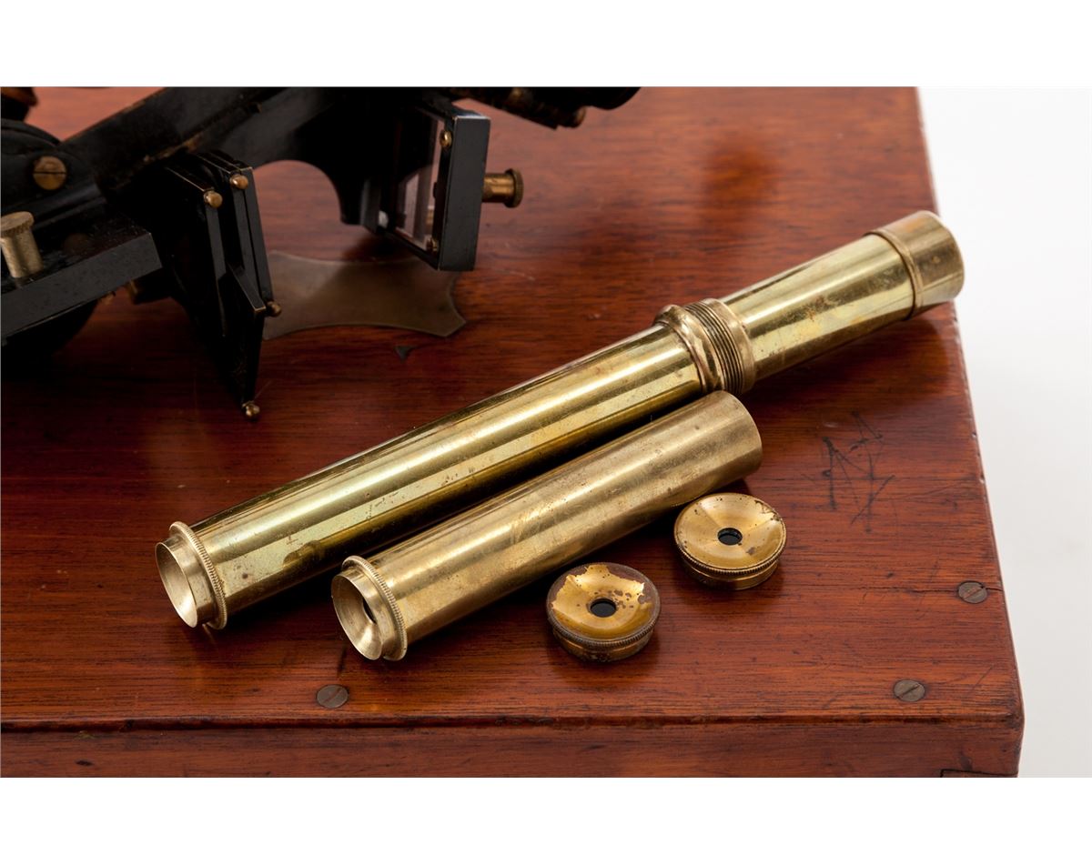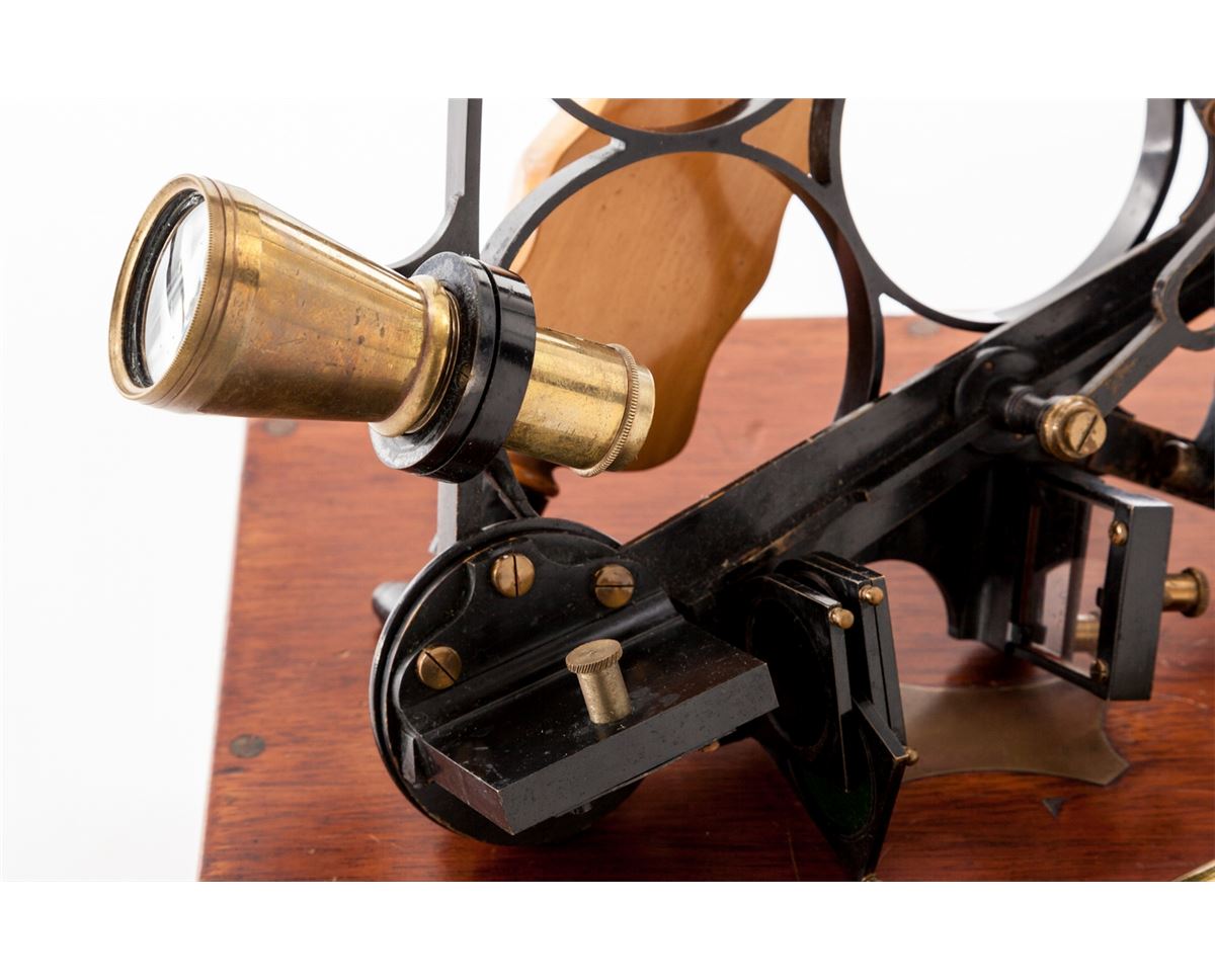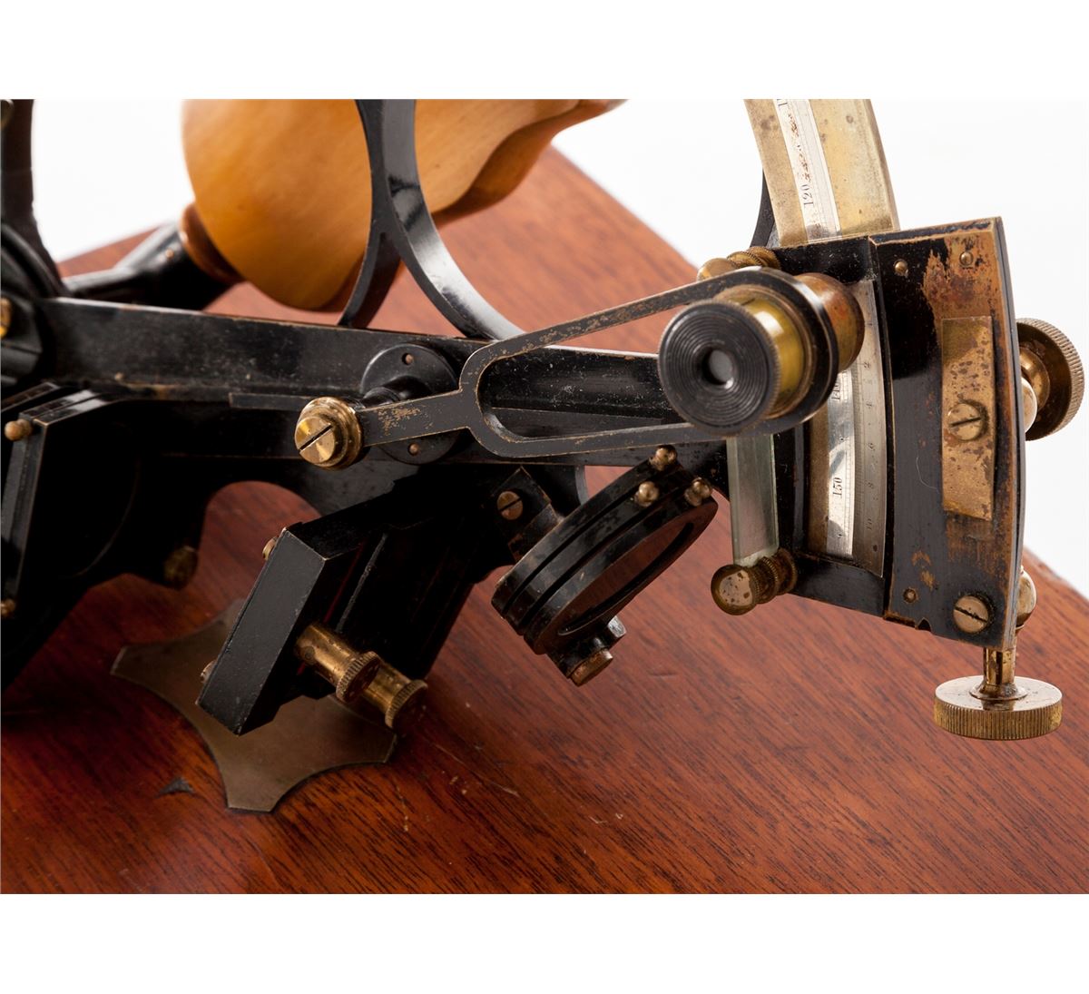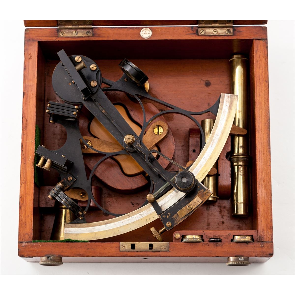 Early 20th Century English Marine Sextant, by Coombes, in mahogany case with all accessories. Gradiant portion marked ''J. Coombes, Optician & Instrument Maker, Devonport''. Condition is fine to near excellent with some paint loss to black portion. All filters and optical lenses are intact. Exterior of case shows just light scuffs and impressions, with one fracture near forward edge of lid that detracts little. Original iron key is present. A very nice nautical decorator. Est.: $500-$750.