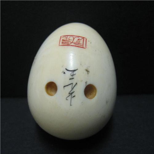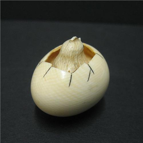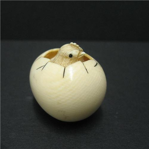 Early 20th C. carved ivory egg netsuke with one small rooster inside; 1 1/2" long; signed on bottom; no visible defects