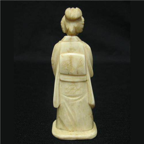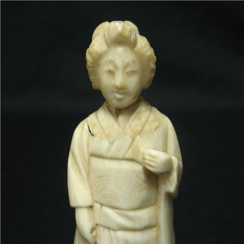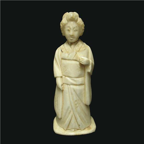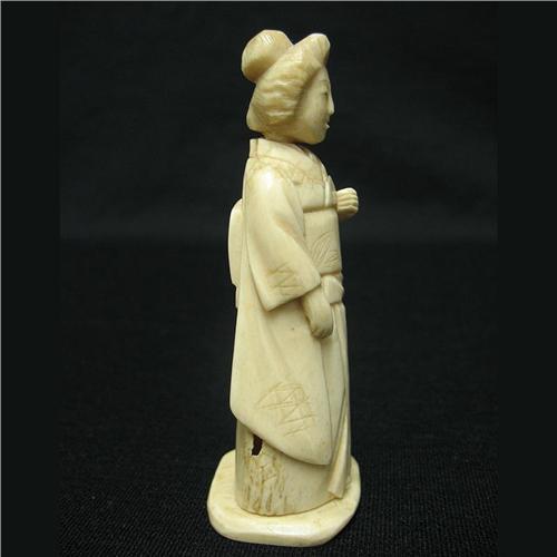 Early 20th C. carved ivory figurine of a woman; made in three sections; hollow bottom; 4" high; 1/4" hole on side of dress; hands drilled for holding object; unsigned
