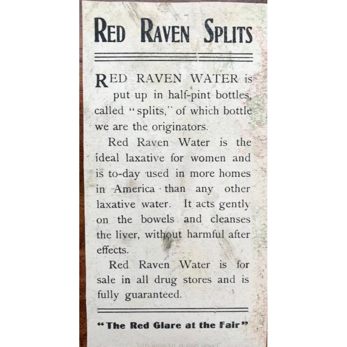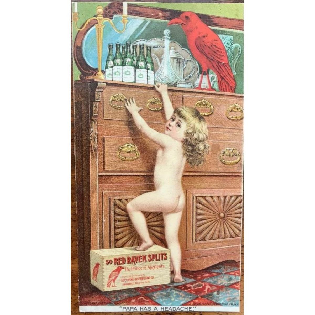 Early 20th Century advertising postcard for Red Raven Splits aperient laxative water, hang over cure. "Papa Has A Headache". 3" W X 5 1/2" H. Red Raven aperient water, was distributed in the United States by Duquesne Distribution Company of Pennsylvania from about 1899 to 1913, and then by the Red Raven Corporation until the 1930ʼs. A liquid laxative, Red Raven bottled in splits was sold by the case or individually primarily through liquor wholesalers and retailers. Duquesne claimed that they were the first producers of the “split†bottle form – basically a size that would hold enough purgative for one personal dose, about 1/5th of a quart. Supposedly, one dose of Red Raven cured headache, indigestion, gout, gall-stones, and any number of uncomfortable maladies caused by over-indulgence. It was marketed as a cure-all, but was basically a common saline laxative, with some sodium bicarbonate to settle the stomach. Additional sodium compounds may have acted as electrolytes, possibly helping the drinker remain hydrated, but abuse of saline laxatives could lead to serious dehydration and other maladies.â€