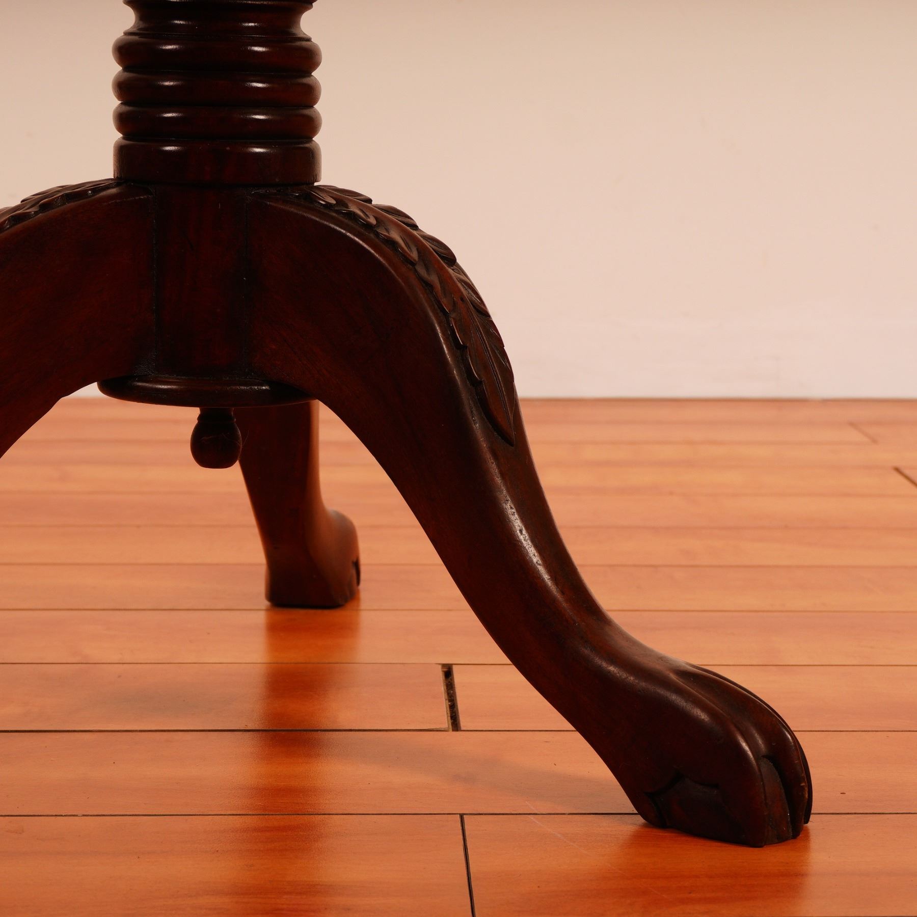 This exquisite mahogany pedestal stand features an intricately hand-carved design of grape clusters and vine leaves spiraling up the central column, culminating in a beautifully scalloped circular top. The rich, deep mahogany finish enhances the natural luster of the wood, while the tripod base rests on claw feet adorned with finely detailed leaf carvings. Perfect for displaying a sculpture, vase, or fine decorative piece, this pedestal embodies the craftsmanship and opulence of early 20th-century furniture making. A refined and stately accent ideal for traditional interiors or elegant gallery spaces.