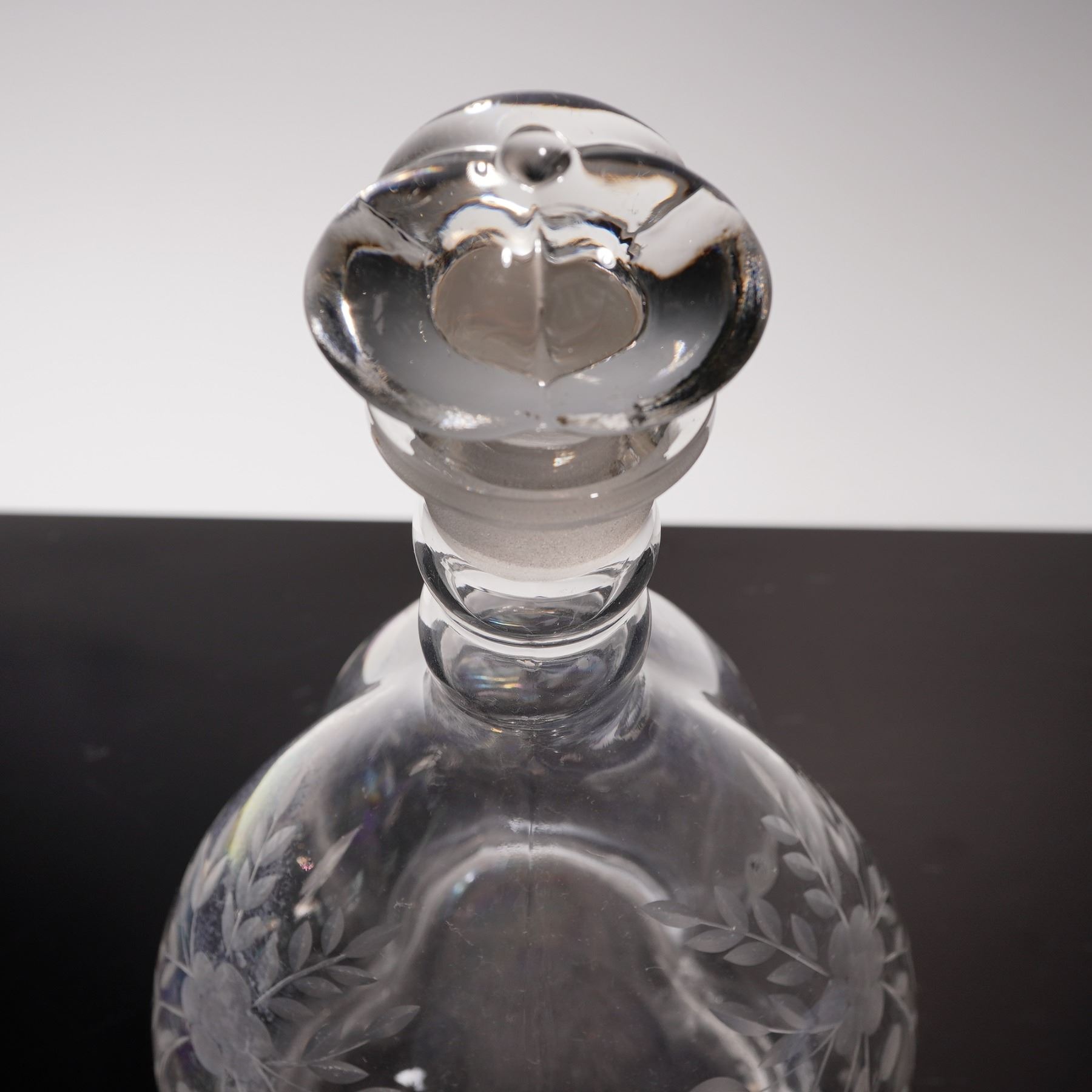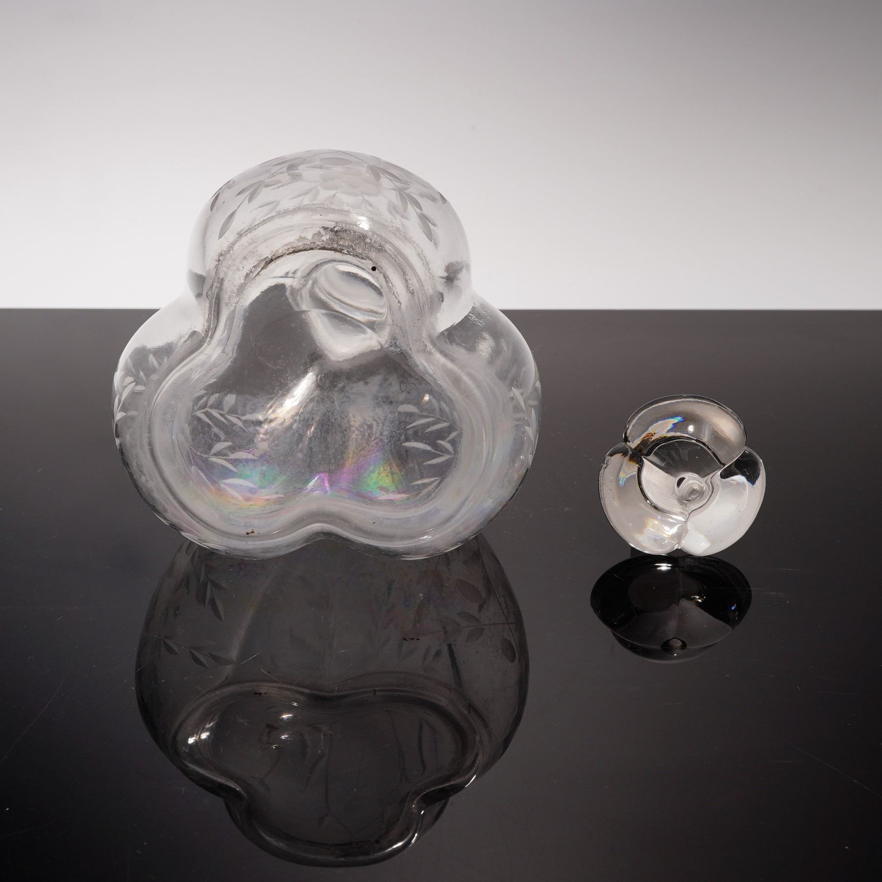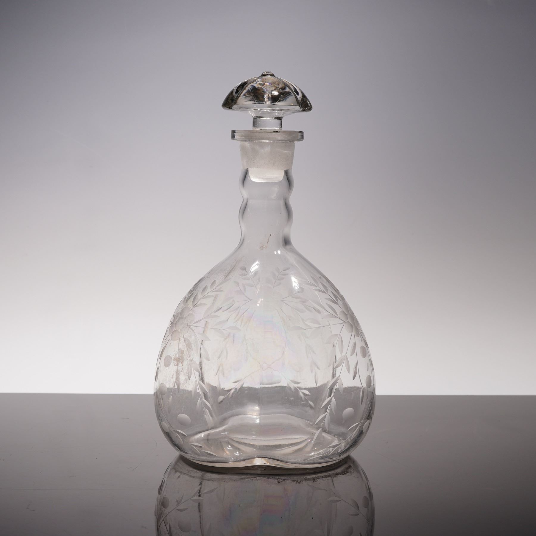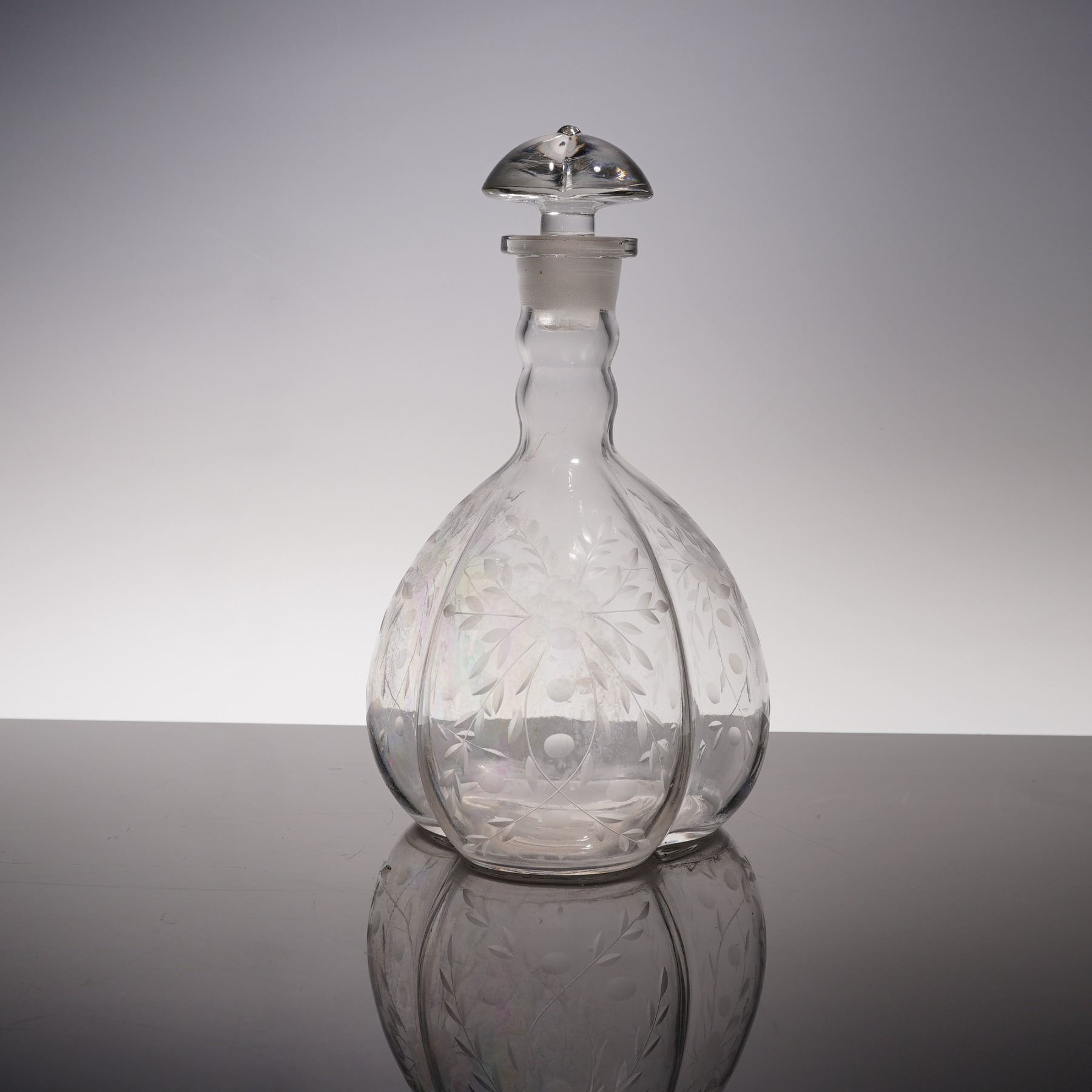 This early 20th century blown glass decanter features a distinctive lobed melon form body with delicate floral and foliate etching to each panel. The clear glass surface exhibits a slightly iridized sheen, particularly in the lower body, giving the piece a subtle opalescent glow under light. It is topped with a matching clear glass stopper of unusual mushroom shape, which fits into a ground neck and complements the softly contoured silhouette of the vessel. The stopper shows a chip, and there is some interior residue present, consistent with age and use. A charming decorative decanter for a vintage inspired bar or glassware collection.