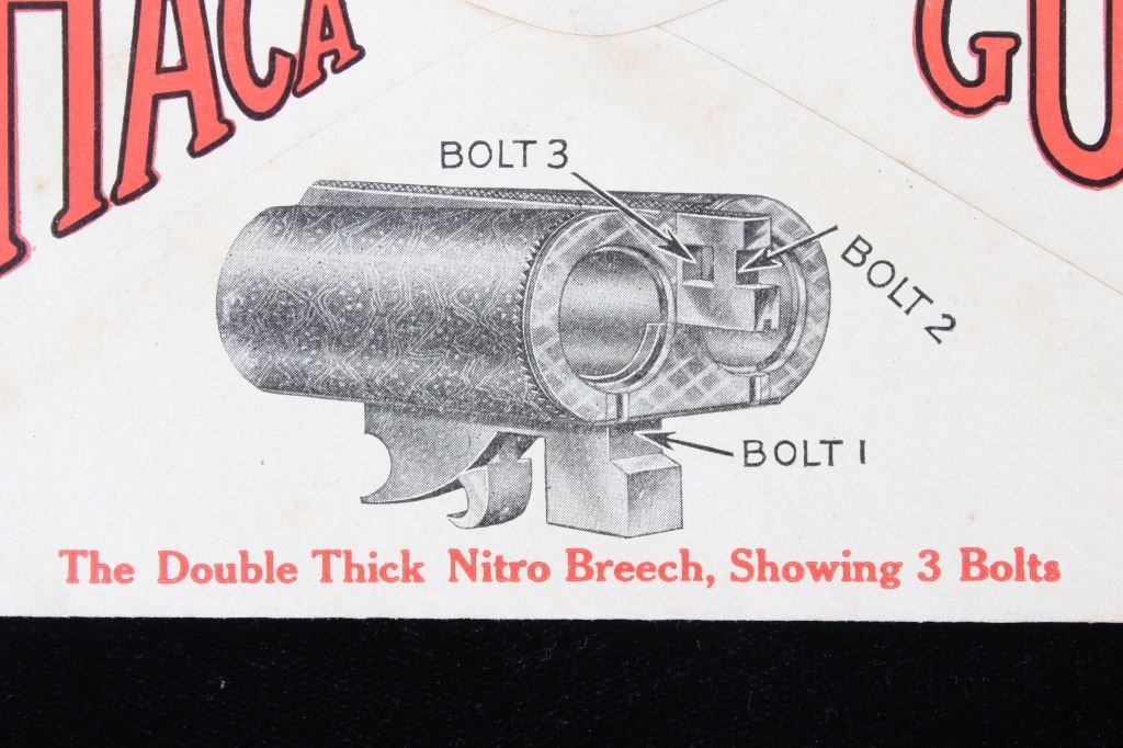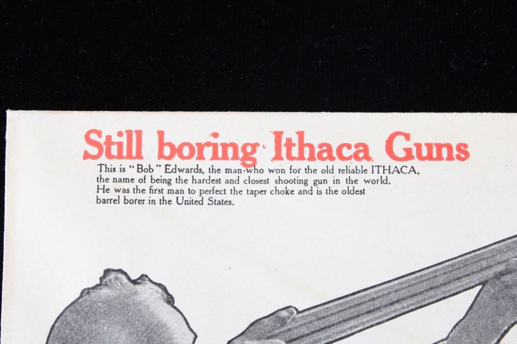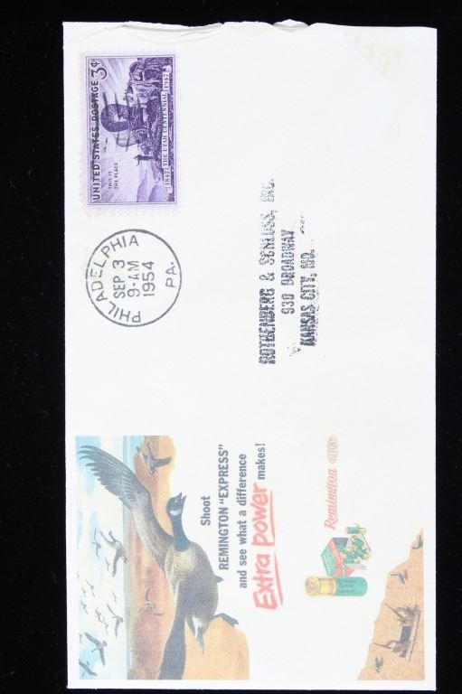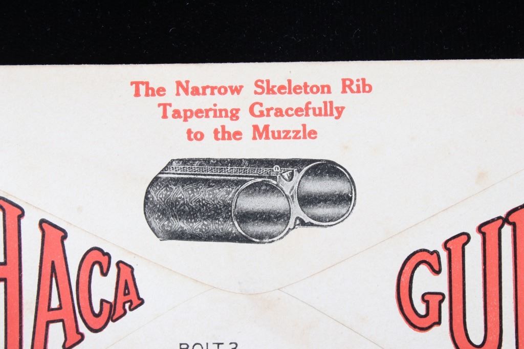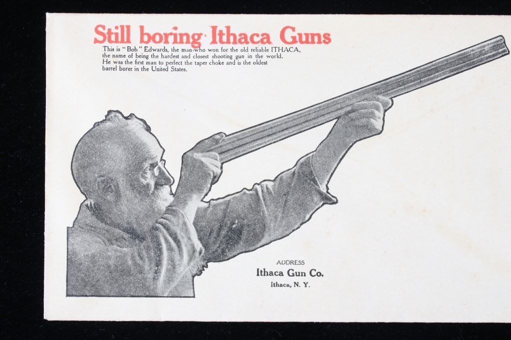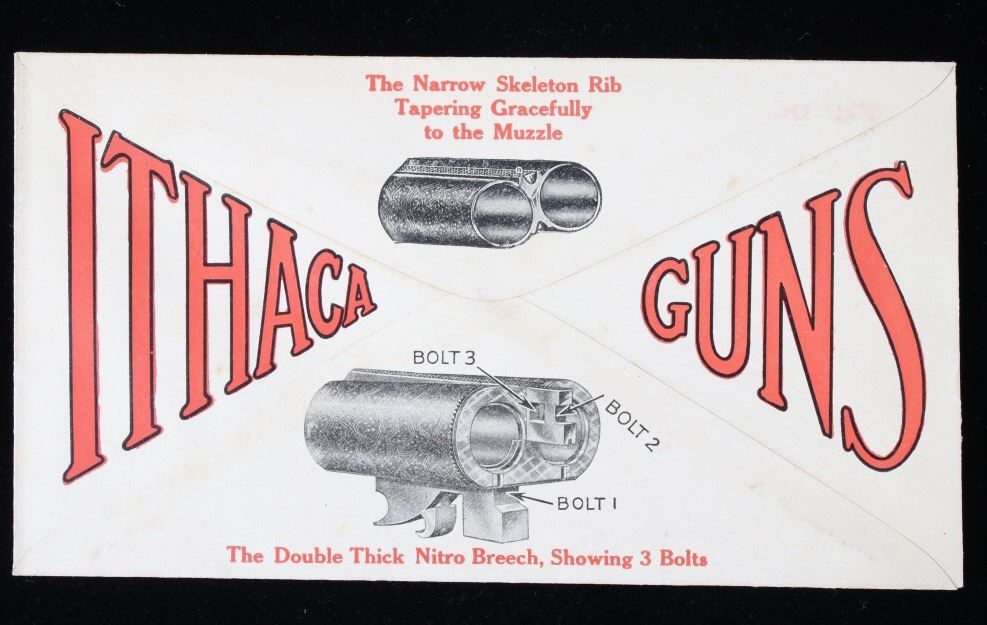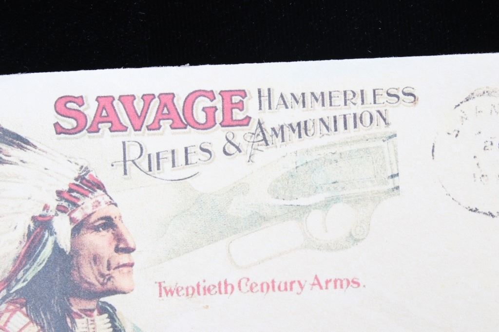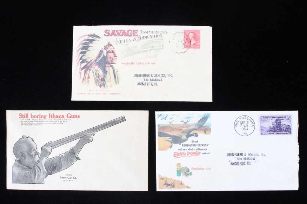 Featured in this lot we have a set of three firearm manufacturer envelopes originating from the early 20th century. The collection shows three envelopes from three different firearm manufacturing companies. The first of the envelopes shows a Native American is full chiefs garb with the words "Savage Hammerless Rifles & Ammunition Twentieth Century Arms" across the front. The envelope displays a US postage stamp along with a stamped address and postage across the front. The back is stamped "Special Delivery Kansas City". The second piece is an Ithaca Guns envelope with Bob Edwards staring down a shotgun barrel and is titled "Still Boring Ithaca Guns". The back of the envelope shows two diagrams of double barreled shotgun barrels and recerver and is marked "The Narrow Skeleton Rib Tapering Gracefully to the Muzzle - Ithaca Guns- The Double Thick Nitro Breach, Showing 3 Bolts". The third and final piece is a Remington express envelope with the image of Canadian geese flying over two hunters. The piece shows a postage stamp and has the address and Philadelphia post office stamp. The back of the envelope is marked with a stamped Notice across the back. The set show good condition overall with some minor wear and having been opened. The envelopes measure 6 1/2" wide by 3 5/8" tall.